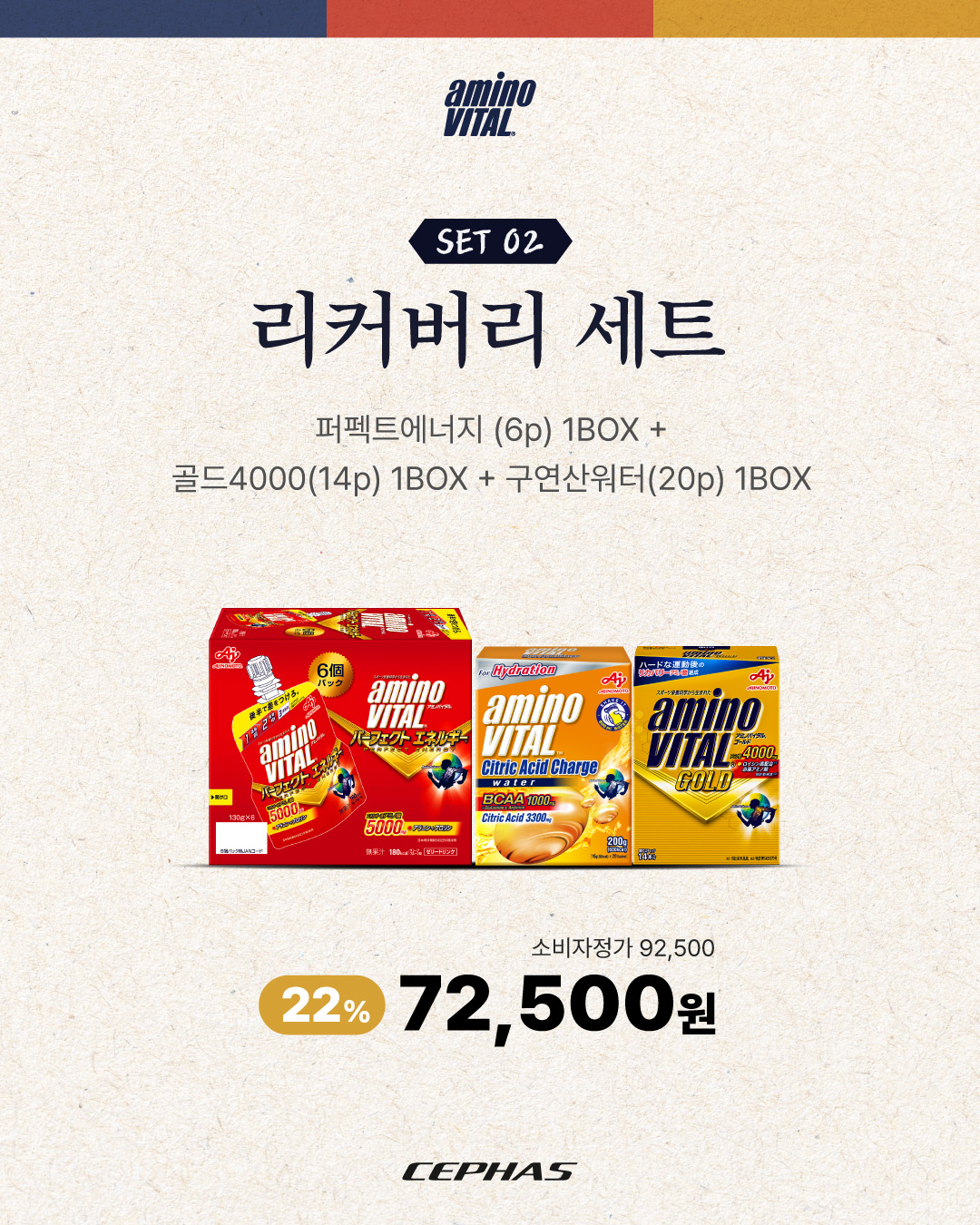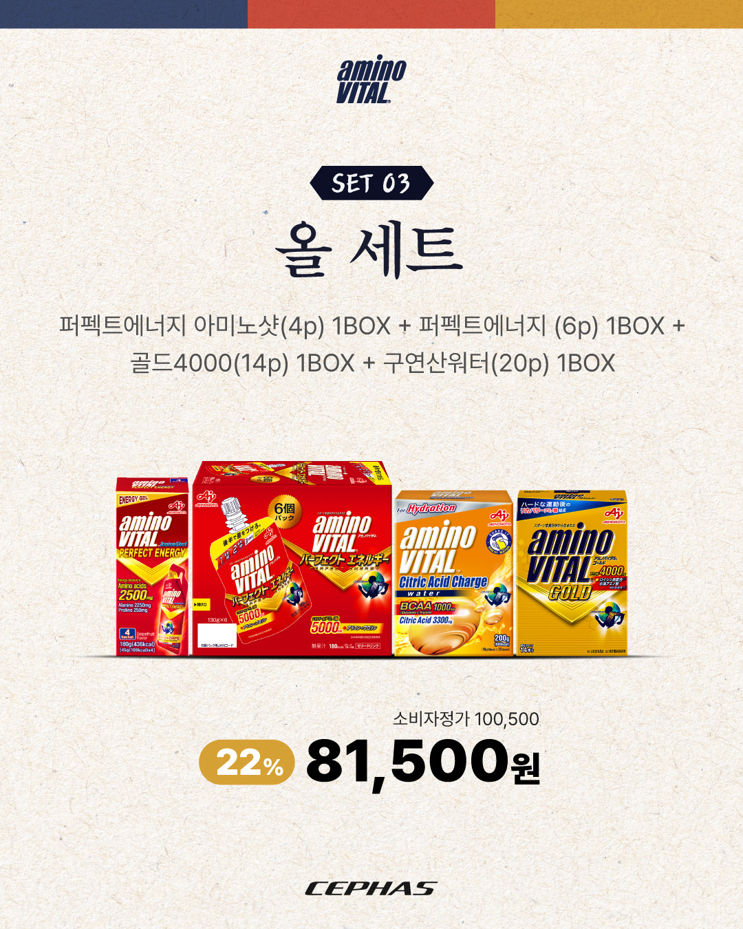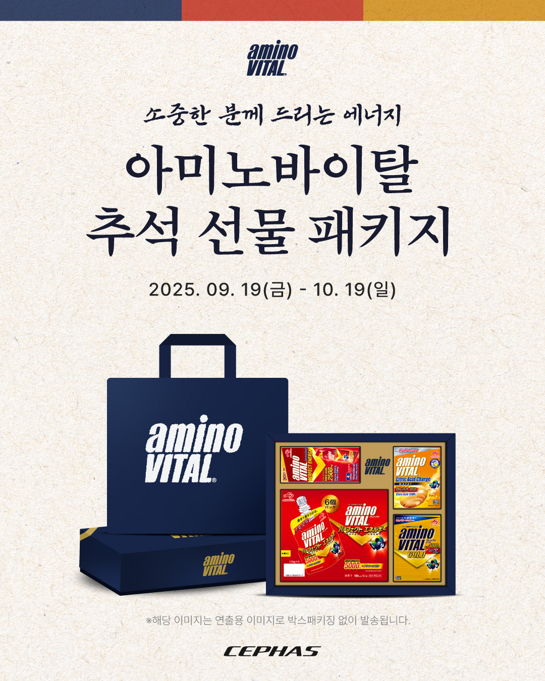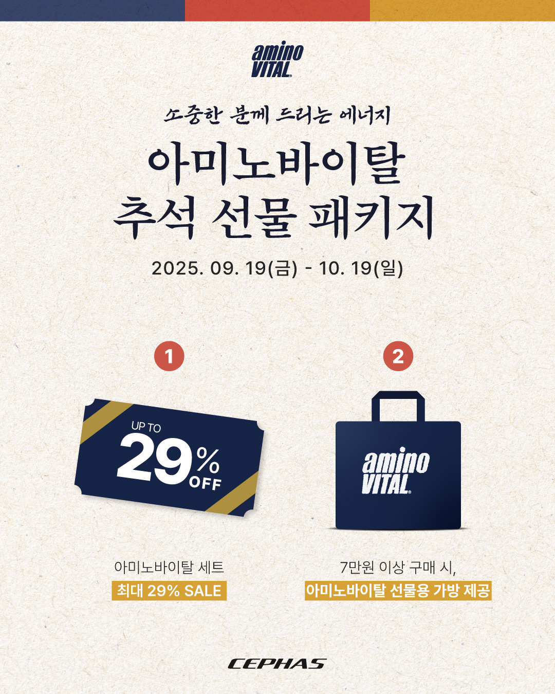 아미노바이탈을 공식 유통하는 세파스는 오는 추석을 맞이해 10월 19일까지 '아미노바이탈 추석 선물 패키지' 할인 프로모션을 진행한다. 이번 프로모션은 아미노바이탈 세트 최대 29% 할인과 함께 7만원 이상 구매 시 선물용 가방이 함께 증정된다.