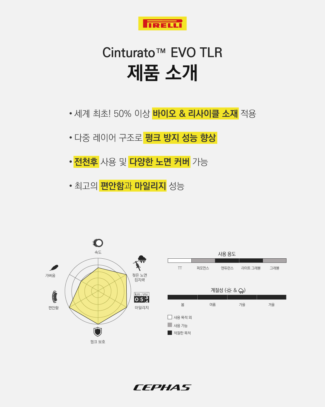 신투라토 에보는 세계 최초로 50% 이상의 바이오 및 재활용 소재를 사용해 환경을 생각하는 동시에, 피렐리의 기술력을 담아낸 친환경 퍼포먼스 타이어다. 도로는 물론 도심, 가벼운 그래블까지 모든 주행 조건에서 안정적인 그립과 최상의 승차감을 제공하는 것이 특징이다.