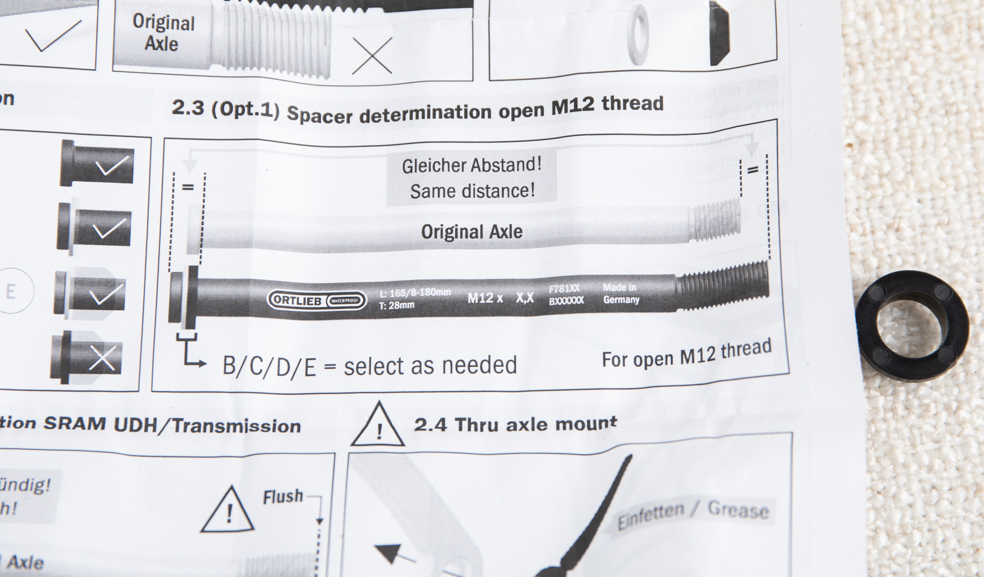 장착은, 기존 쓰루액슬을 제거하고 그 자리에 끼우면 되는데, 좌우에 바깥으로 튀어 나오는 액슬의 길이를 비슷하게 맞출 수 있도록 다양한 스페이서가 포함된다.