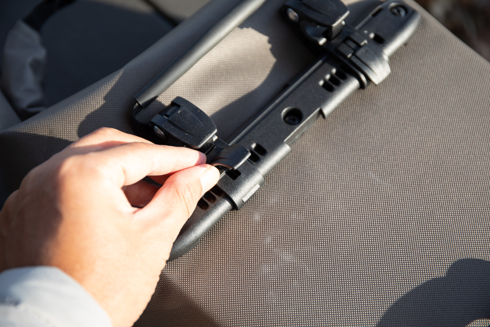 아래의 후크는 다이얼을 푼 후에 위치를 옮겨 랙 튜브의 위치에 맞게 설정하기만 하면 된다. 상단 후크 또한 레버를 열고 쉽게 위치를 옮길 수 있어서, 거의 대부분의 짐받이 랙과 호환된다.