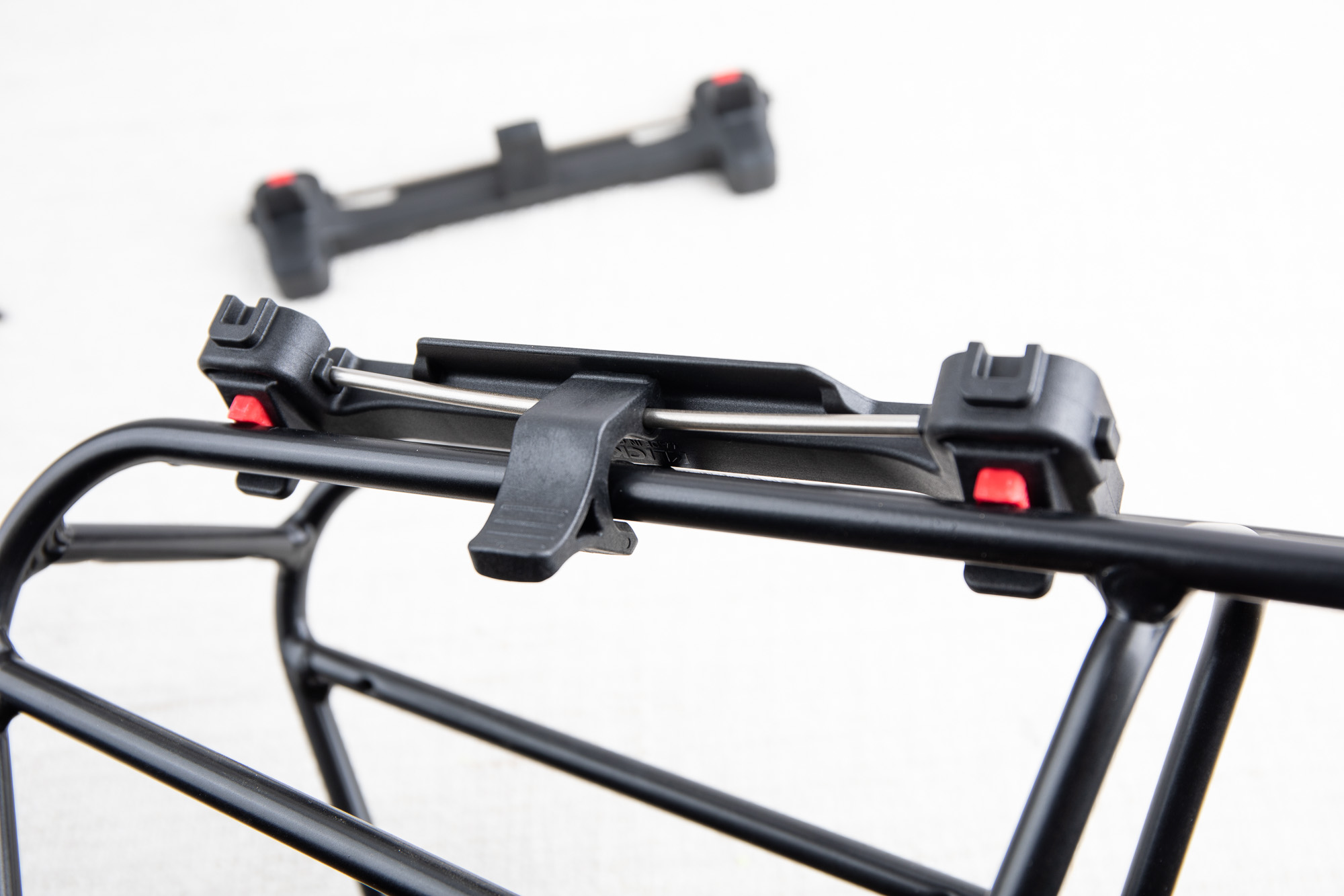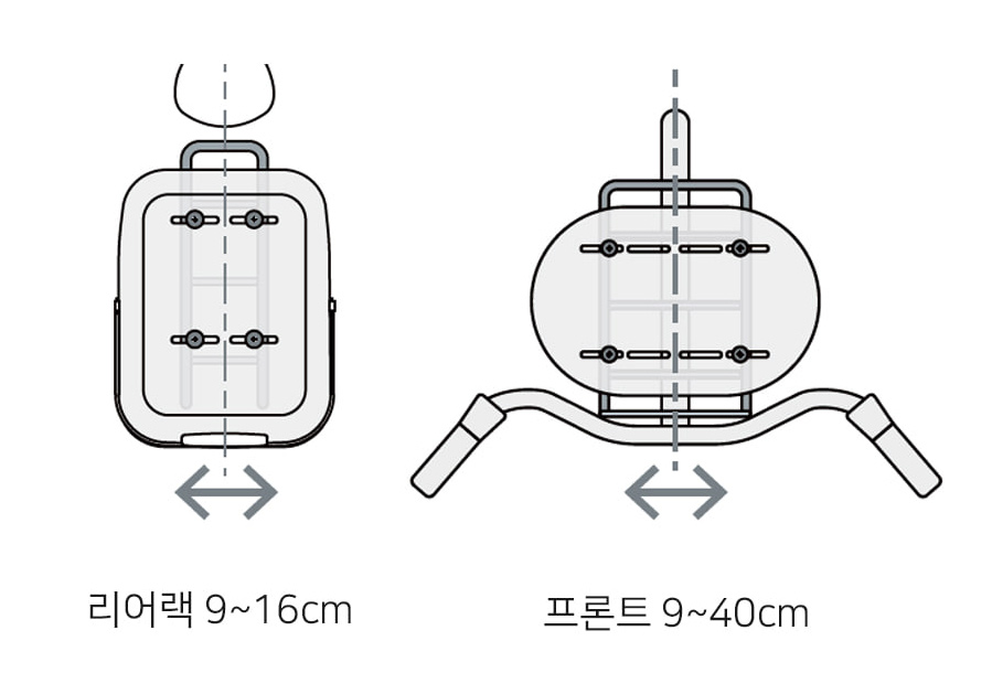 이와 같이 양쪽의 클립 시스템이 분리되어 있기 때문에, 최소 9cm에서 최대 40cm 폭까지 사용할 수 있는데, 이것은 앞 랙의 경우 넓게 제작되는 경우가 많기 때문이다.