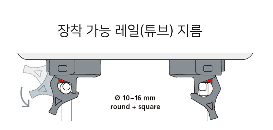 사용 가능한 랙 튜브의 지름은 10~16mm 이며, 20mm까지 가능한 오버사이즈 레버(별매)를 사용할 수 있다.