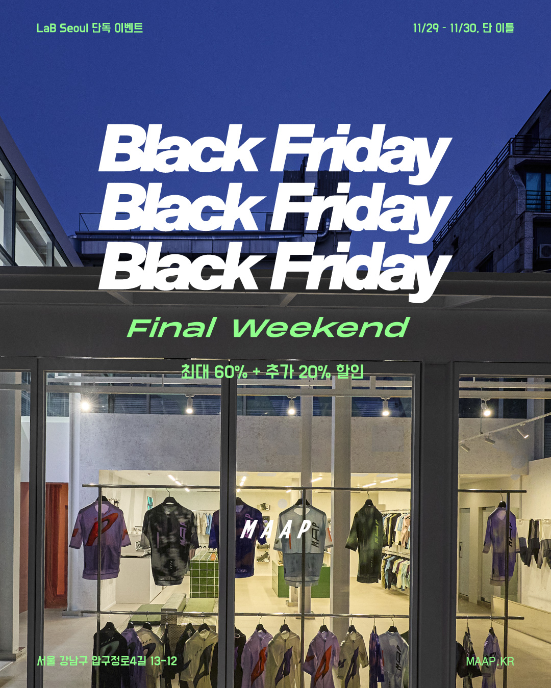사이클링 전문 의류 브랜드 마프(MAAP)는 오는 11월 29일부터 30일까지 블랙프라이데이 할인 이벤트를 진행한다. 이번 프로모션은 마프 랩 서울(MAAP LaB Seoul)에서 단독으로 운영되며, 방문 시 이틀 간의 특별 혜택을 받을 수 있다.
