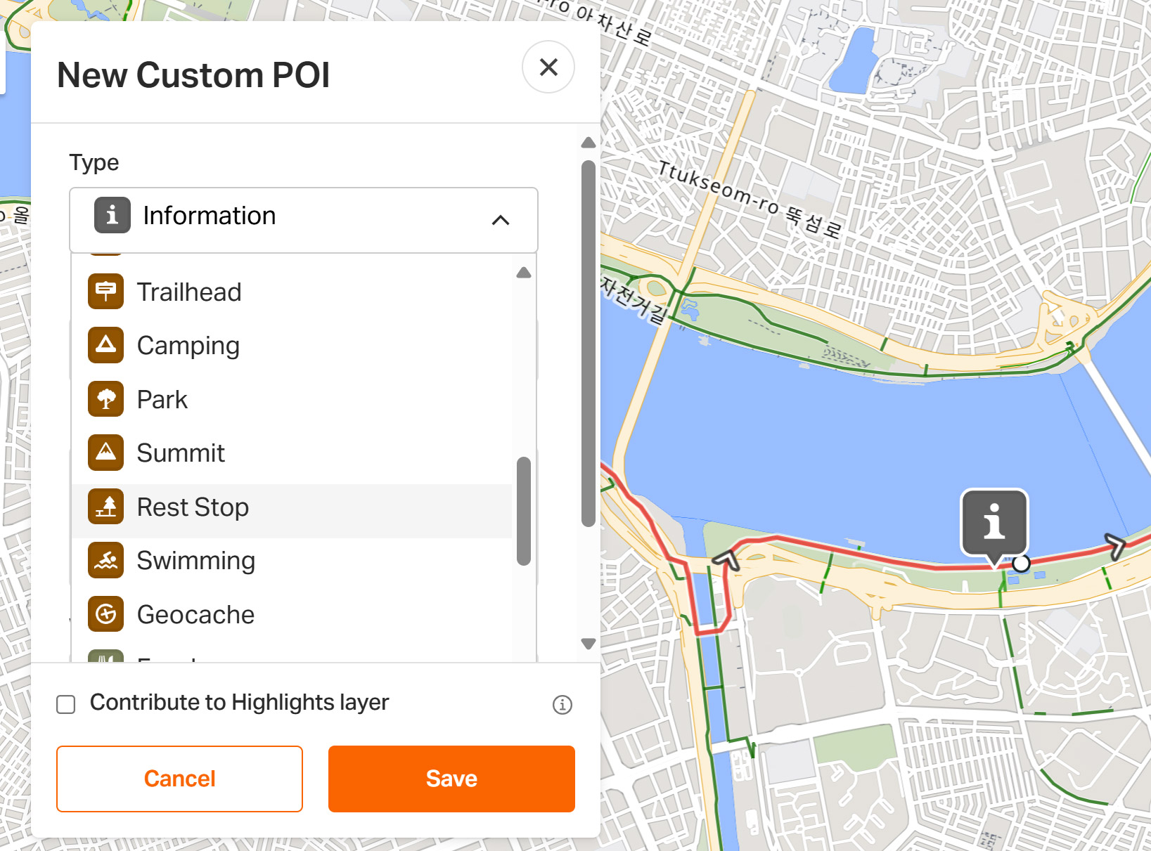 커스텀 POI 입력, 드래그 기능의 코스 수정 등이 다양한 기능이 지원된다.