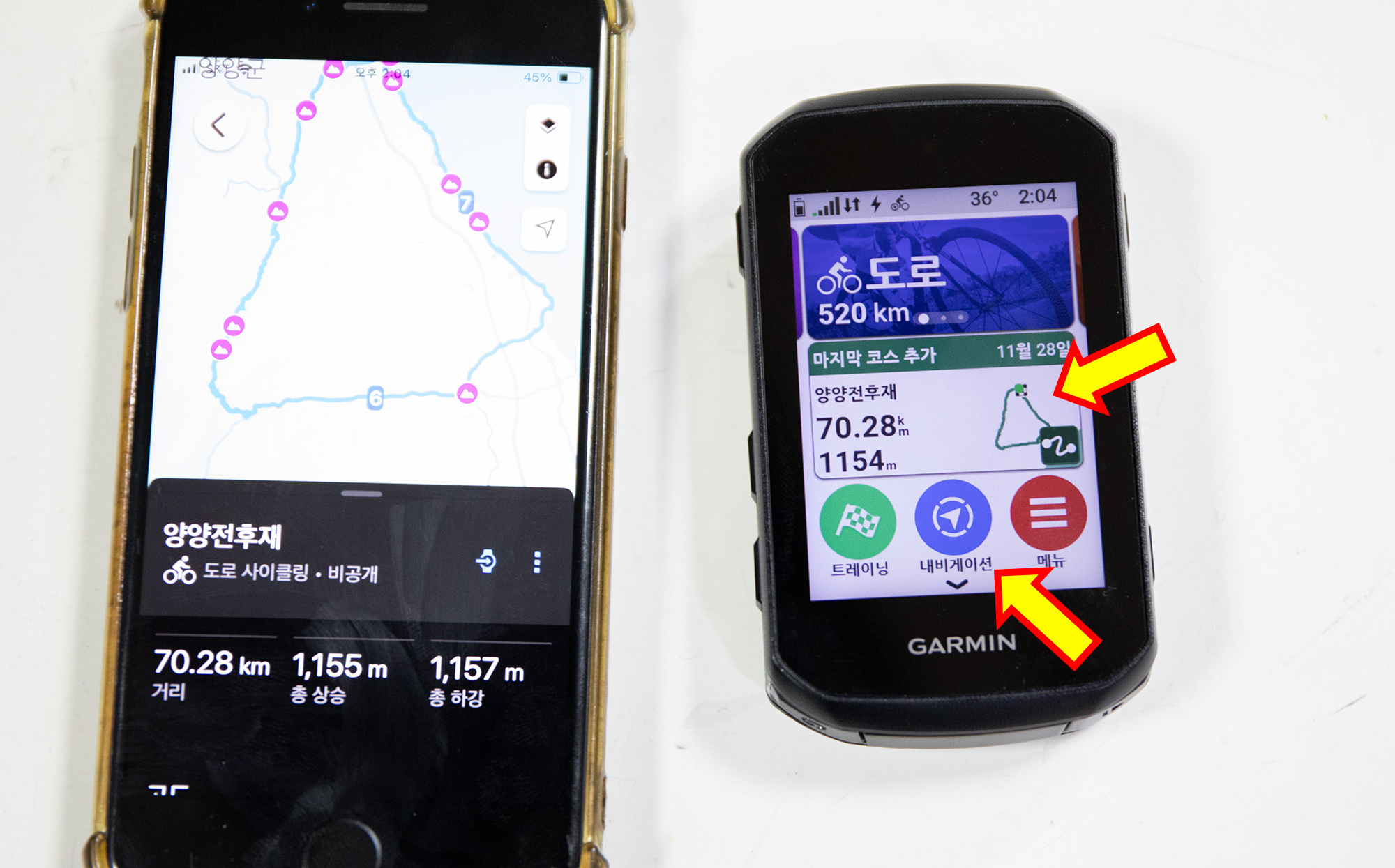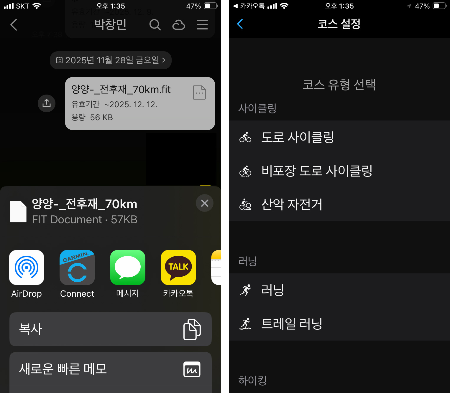 스마트폰에 코스 파일을 다운로드한 뒤 가민 커넥트 앱으로 공유하는 방법이다.