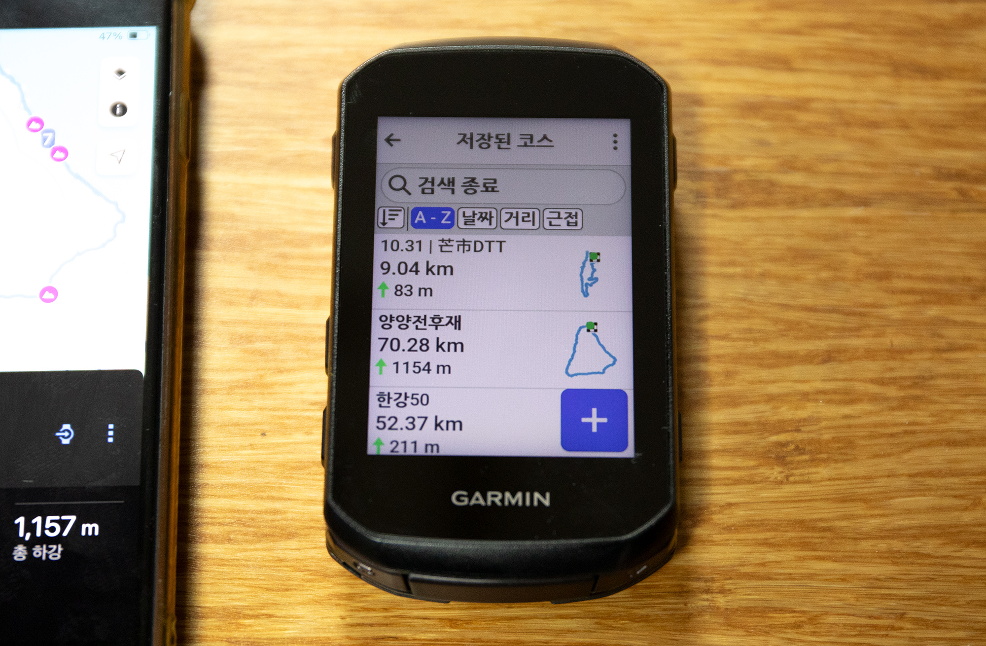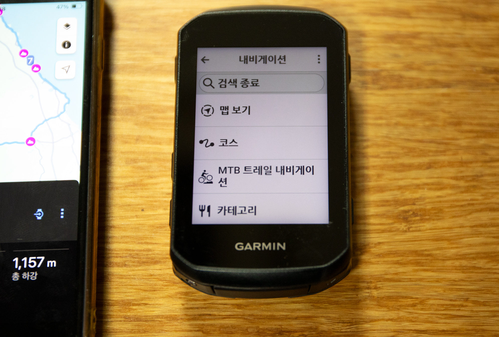 가민 엣지는 최근 활동이 첫 화면에 표시되기 때문에, 코스 등록 후 홈 화면 중앙에서 지도를 확인할 수 있다. 나중에 확인하기 위해서는, 아래 [내비게이션] 버튼을 선택 후 코스를 누르면, 등록된 코스를 확인할 수 있다.