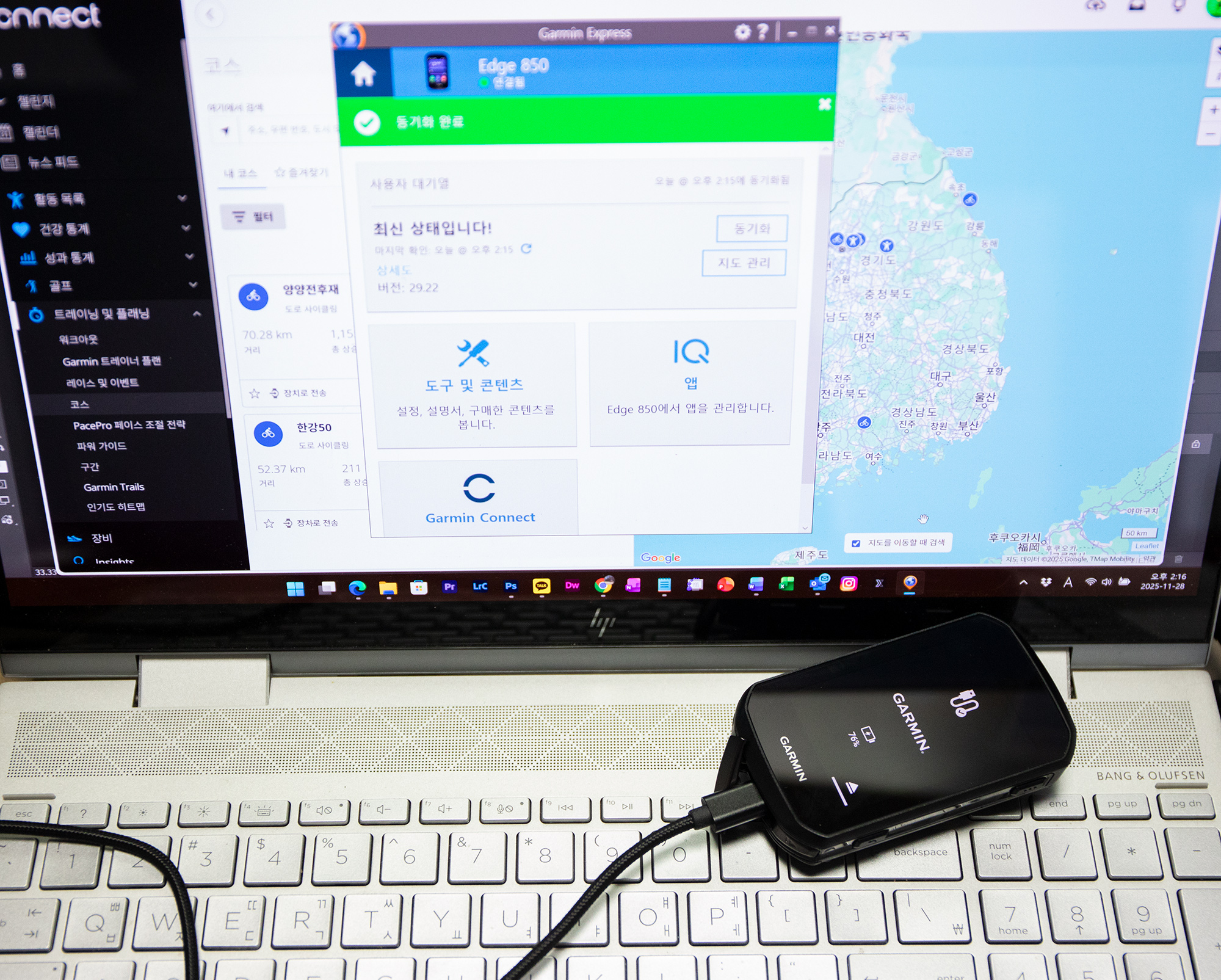가민 커넥트 웹사이트를 통해 서버에 올린 후, Connect 앱을 통해 가민 엣지로 싱크할 수도 있지만, 가민 엣지를 유선으로 PC에 연결하여, 가민 익스프레스(Garmin Express) 프로그램을 통해 빠르게 싱크(동기화)할 수 있다.