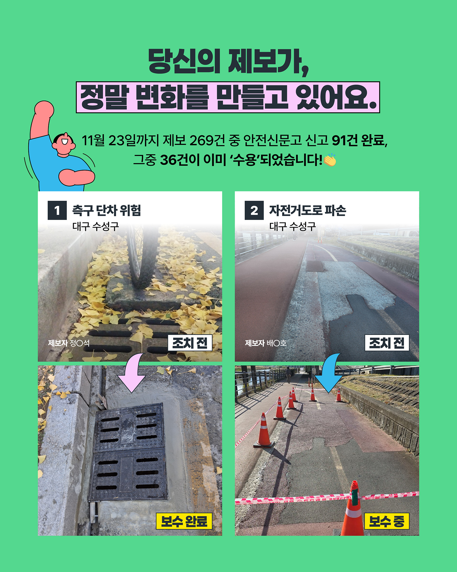 지난 10월 활동을 시작한 바이크액션크루는 11월 23일 기준으로 총 269건의 안전 문제를 신고하는 성과를 거뒀다. 이 중 91건은 정부의 '안전신문고'를 통해 공식 접수되었으며, 현재까지 36건이 지자체 등으로부터 '수용 및 보수 완료' 통보를 받았다.