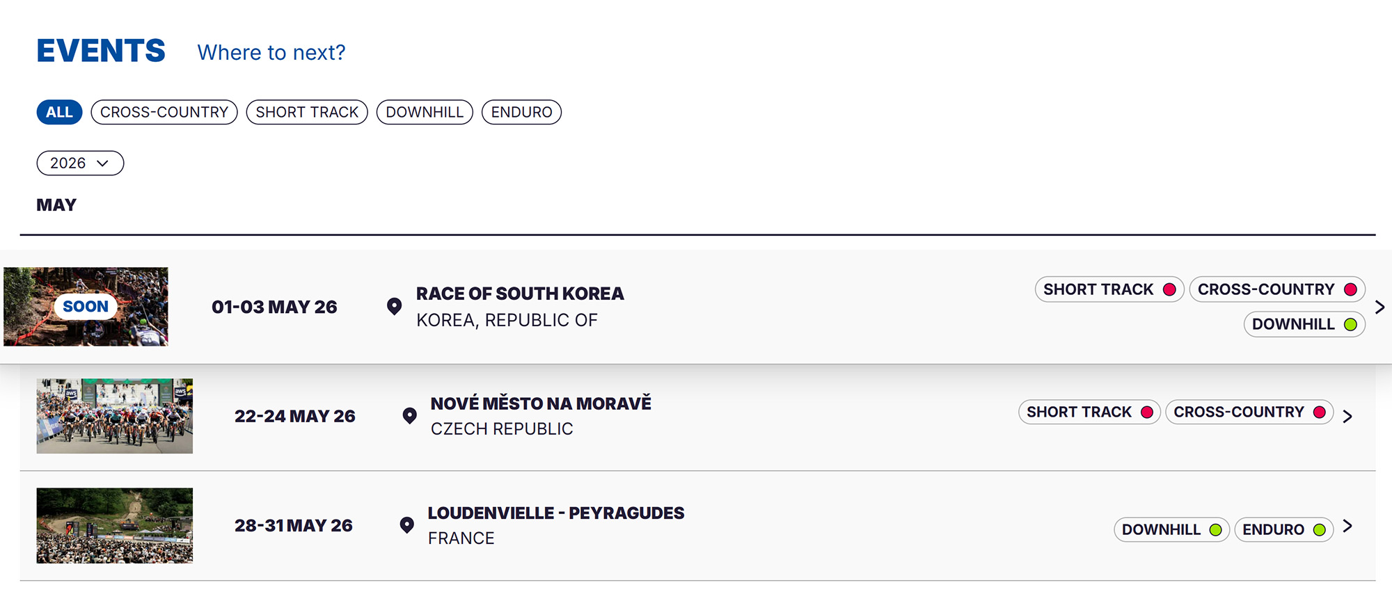 2026년 5월 1일, 우리나라에서 최초로 UCI MTB 월드시리즈 대회가 개최될 예정이다. 세계 최고의 엘리트 라이더들이 참여하는 월드컵 대회로, 아시아에서도 현재 유일하게 우리나라에서 개최를 앞두고 기대와 주목을 받고 있으며, XCC/XCO/DH의 주요 종목이 모두 열리는 대회로는 아시아 최초다.