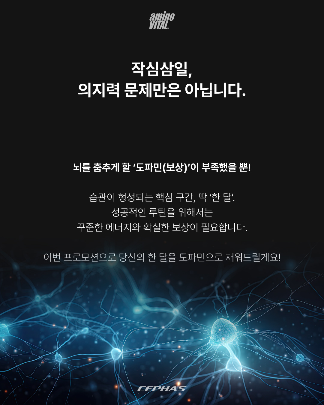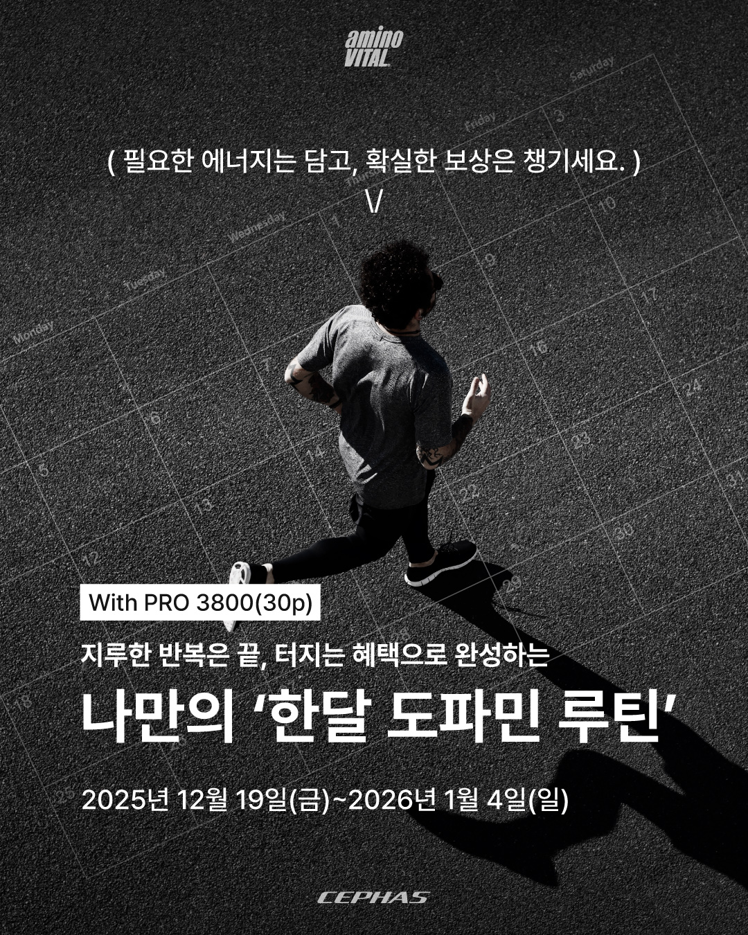 아미노바이탈의 공식 수입원 세파스는 12월 19일(금)부터 2026년 1월 4일(일)까지 약 2주간 "지루한 반복은 끝! 터지는 혜택으로 완성하는 나만의 '한 달 도파민 루틴'" 프로모션을 실시한다고 밝혔다.