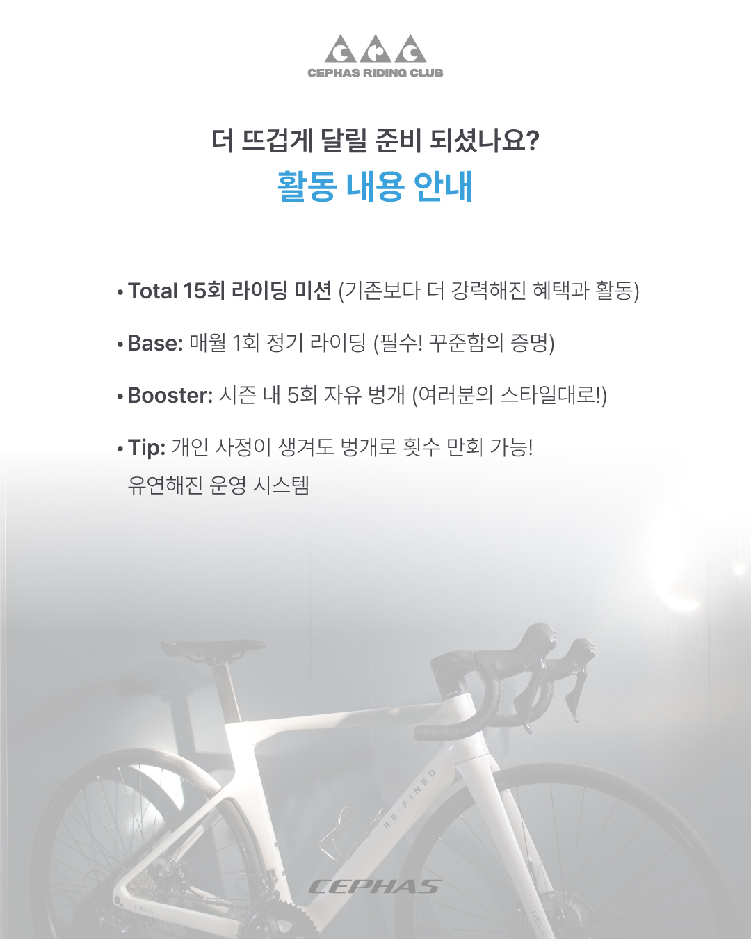 활동량 또한 대폭 강화됐다. 리더들은 활동 기간 동안 정기 라이딩 10회와 벙개(수시 모임) 5회를 포함해 총 15회의 라이딩을 이끌며 세파스 브랜드의 영향력을 알리는 역할을 맡게 된다.