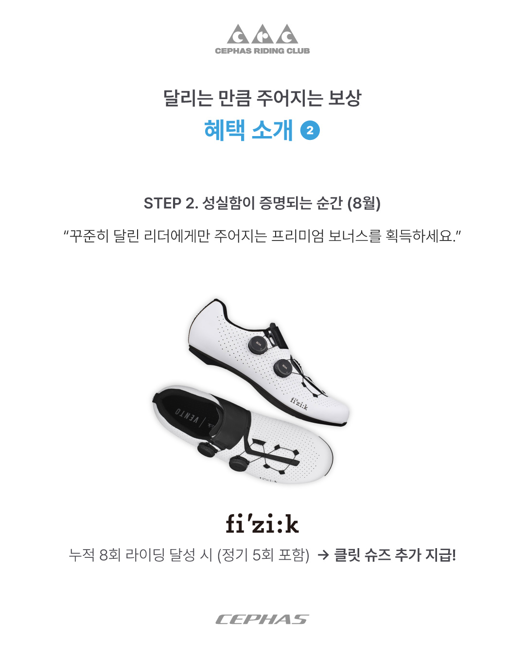 특히 올해는 활동에 따른 성취감을 높이기 위해 추가 보상 제도를 마련했다. 오는 8월까지 총 8회의 라이딩 활동을 달성할 경우, 검증을 거쳐 피직(fi'zi:k) 슈즈를 추가로 지급한다.