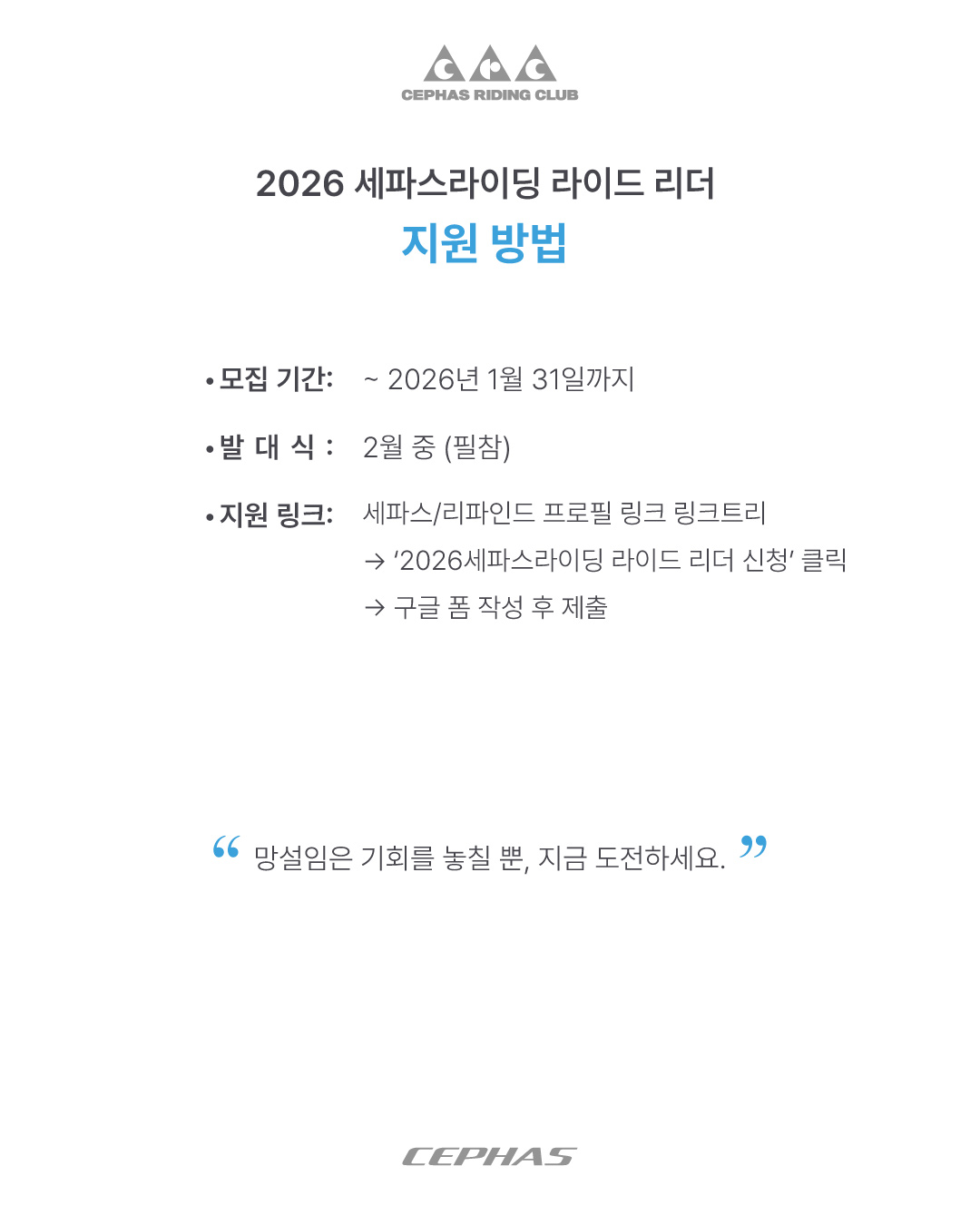 세파스가 다가오는 2026년 시즌을 함께 달릴 ‘2026 세파스 라이딩 리더’를 모집한다.