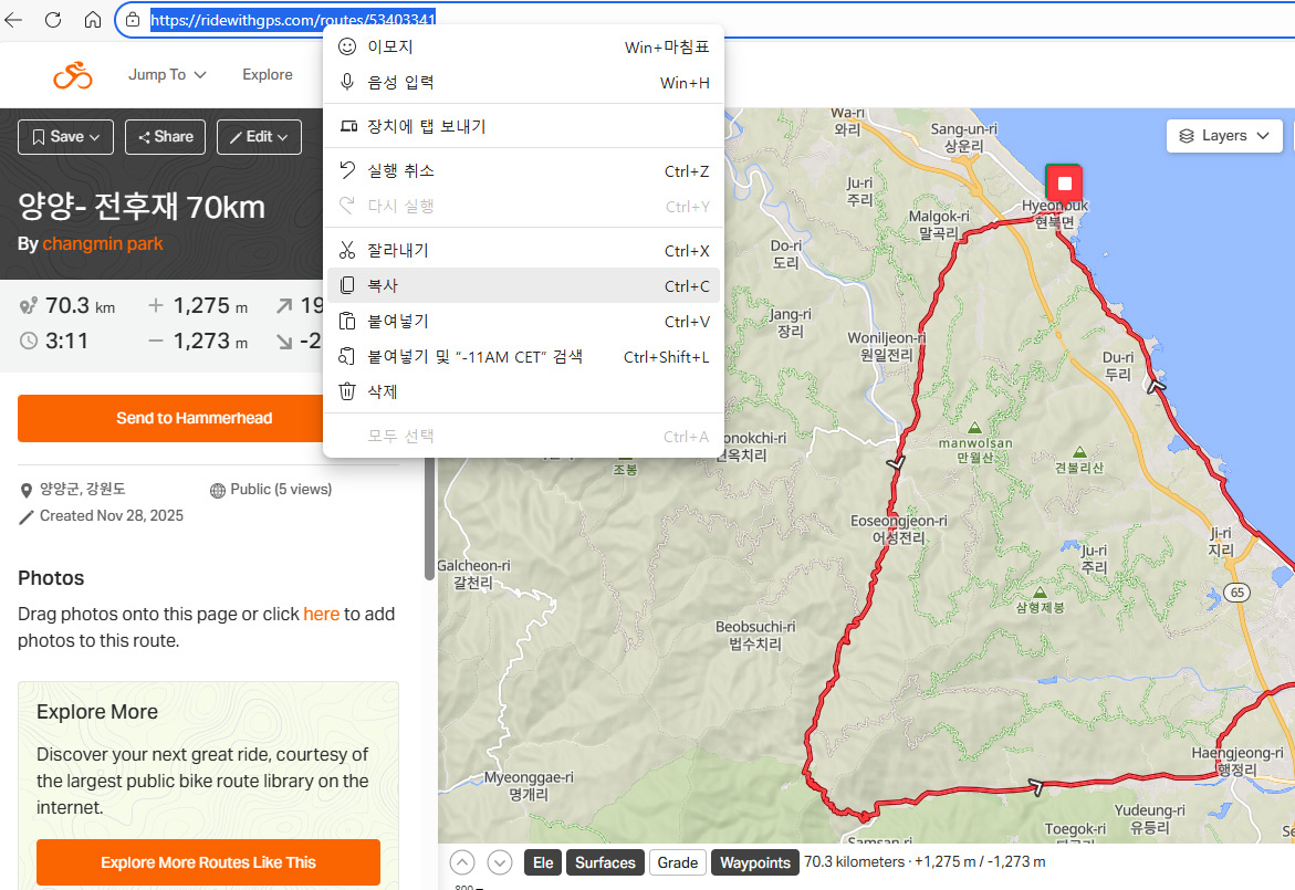 해머헤드 대쉬보드 경로->추가하기->경로 가져오기 화면에 URL 붙여넣기 하면 바로 저장