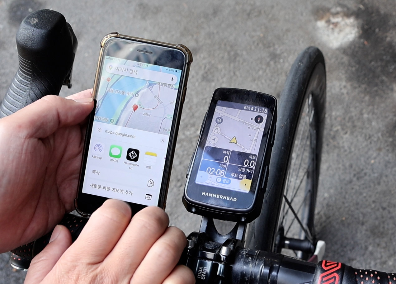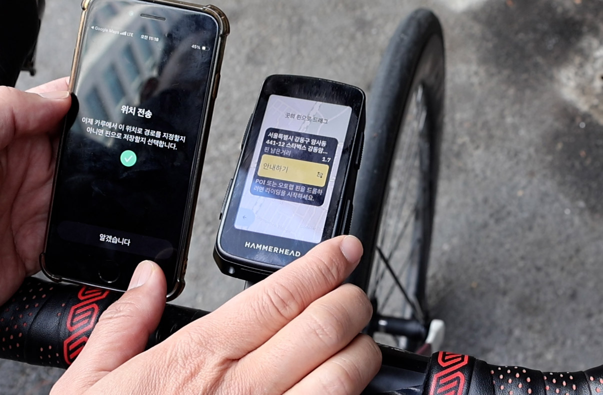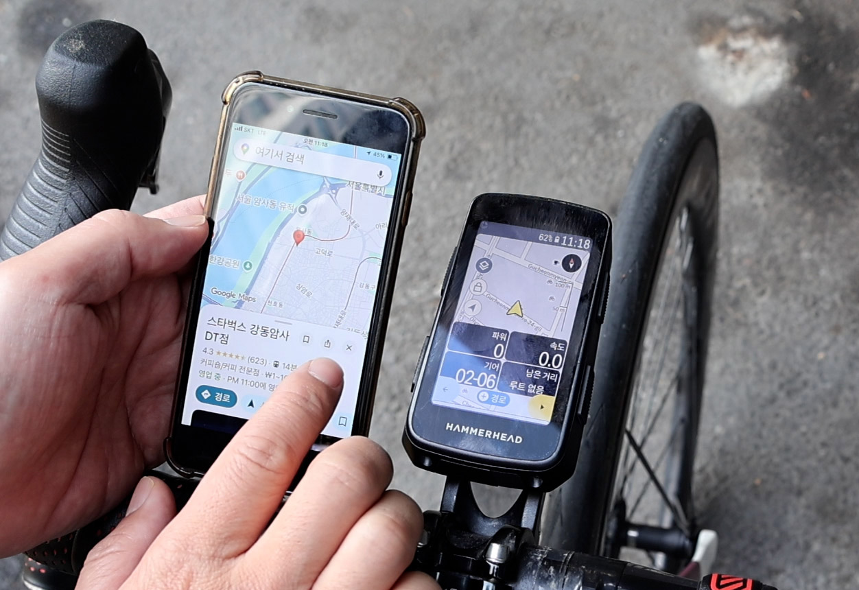자전거를 타면서 근처의 목적지를 가야 할 때, 휴대폰의 내비게이션을 열고 가려면 휴대폰 거치대가 필요하다. 하지만, 해머헤드 카루와 어플을 이용하면 쉽게 목적지 내비게이션이 가능하다.