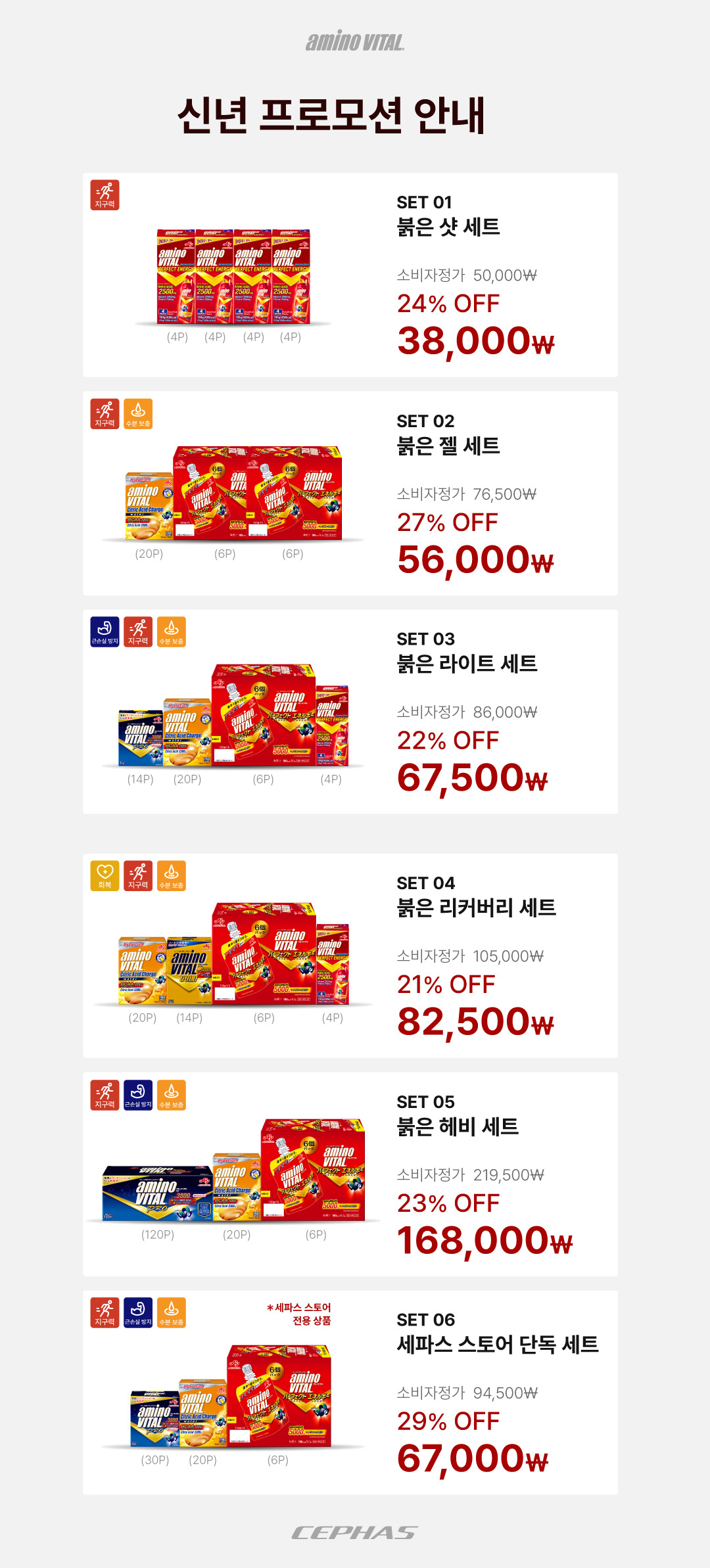이번 신년 프로모션 제품은 세파스 공식 스마트스토어를 비롯하여 전국 아미노바이탈 공식 취급 대리점에서 구매 가능하다.