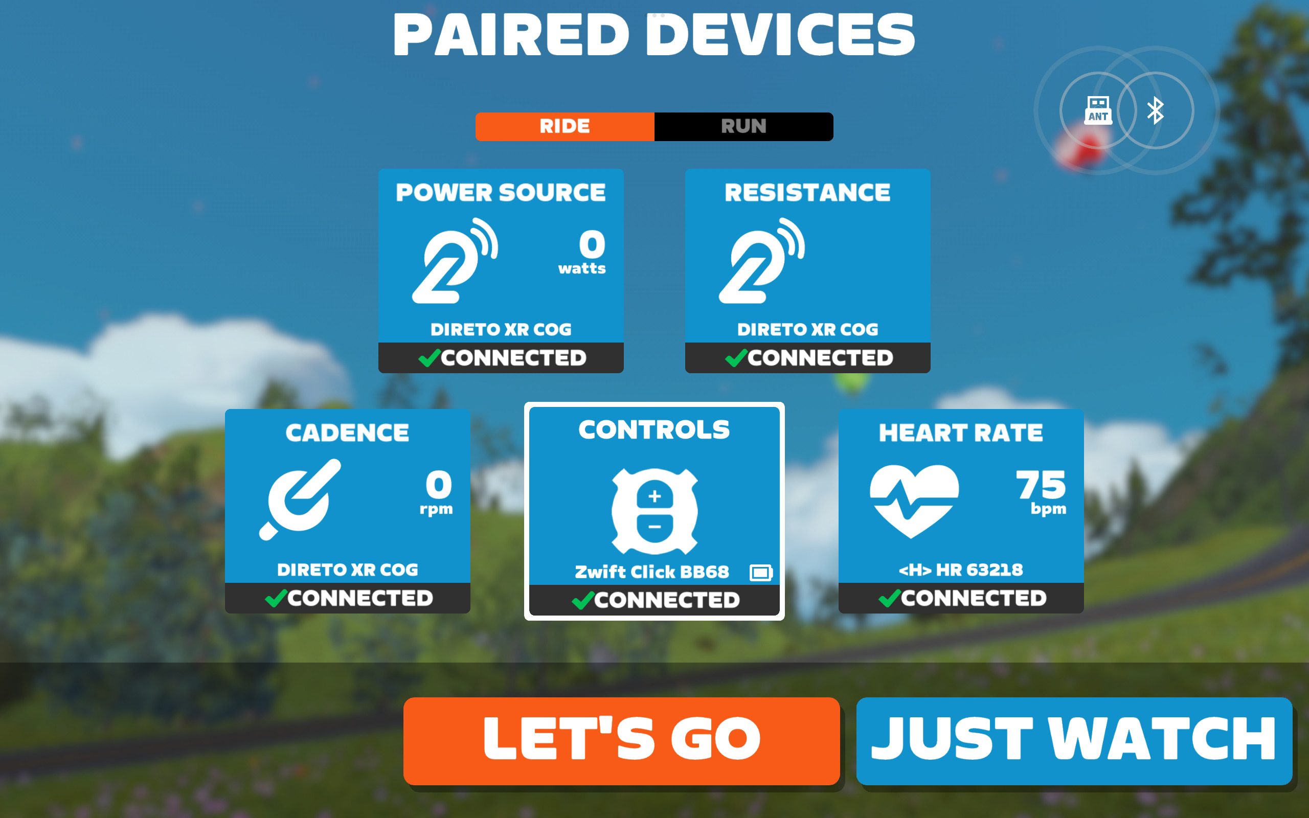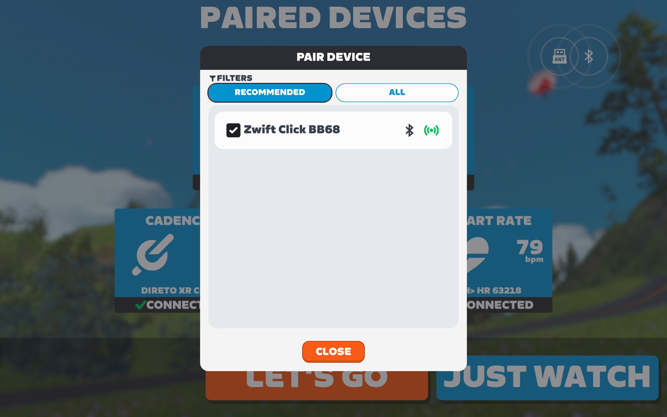 즈위프트에서 Controls 장비 페어링으로 즈위프트 클릭 연결. 클릭 버튼을 누르면 화면에 표시된다.