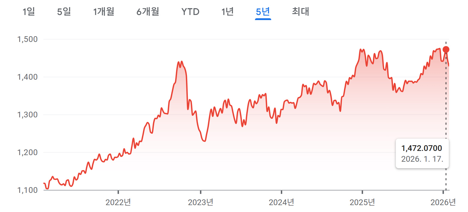 2021년 1100원 초반의 달러 환율은 현재 1500원에 가까운 수준이 되었다.