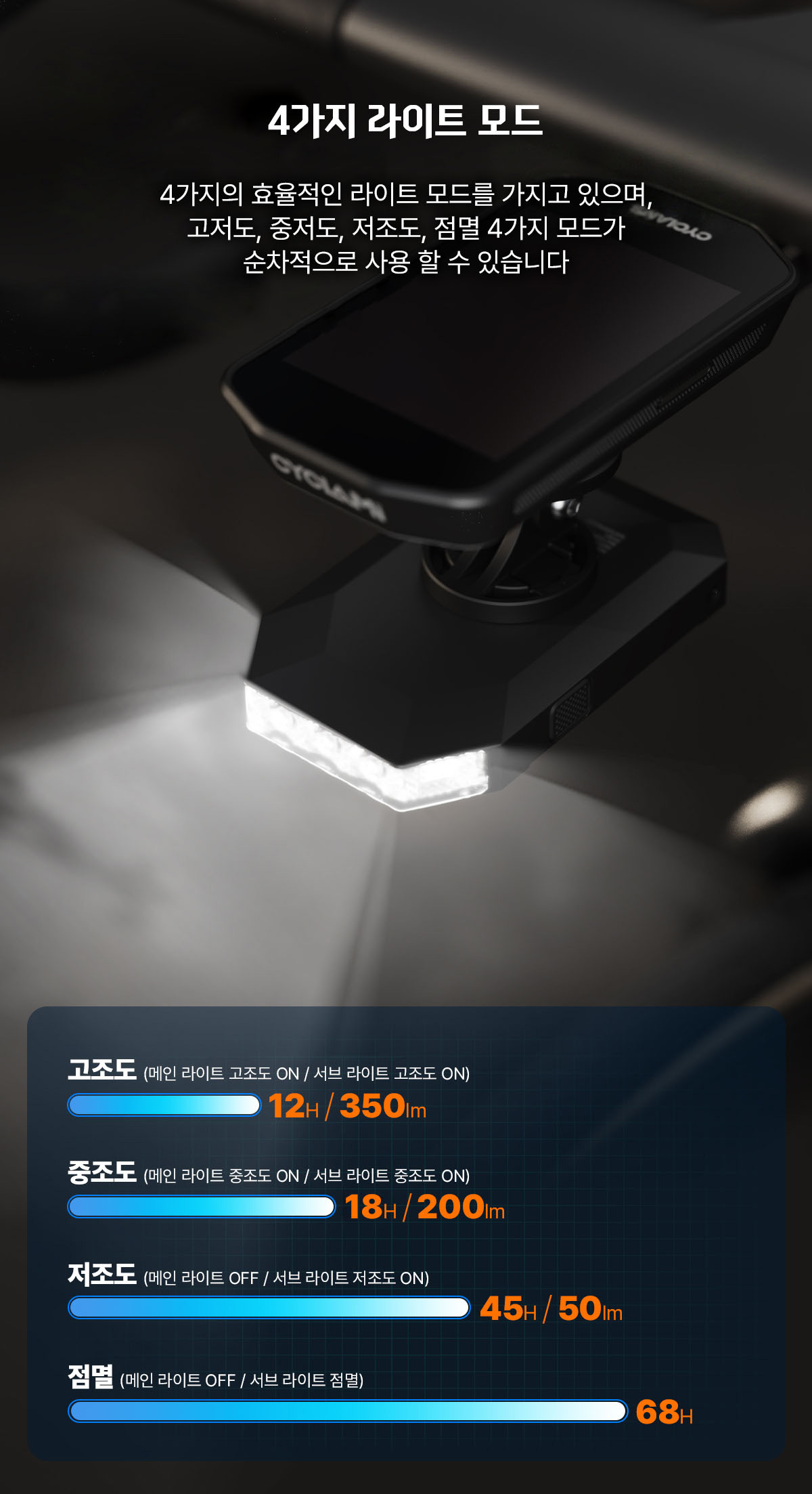 일반 도로에서 주행 시 충분한 수준의 밝기를 제공하면서, 좌우 측면 라이트가 있어서 측면 시인성까지 확보해 준다. 게다가 4가지 모드로 밝기를 조절할 수 있어서, 12시간 이상 최대 45시간까지 전조등 역할을 수행한다.