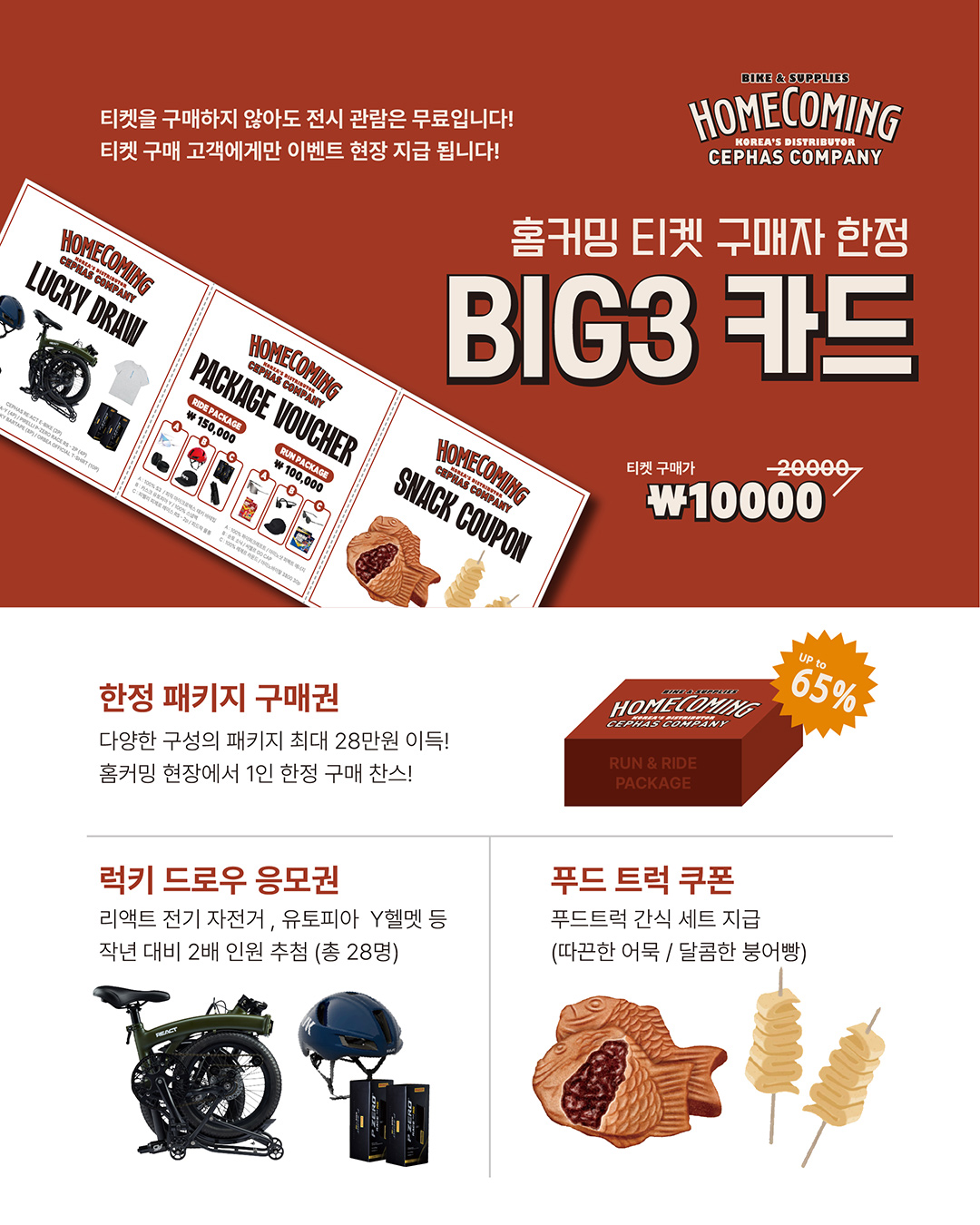 행사 입장 티켓은 1월 30일(금)부터 2월 13일(금)까지 판매되며, 티켓 구매자에게는 파격적인 혜택이 제공된다. 특히 핵심 혜택으로 꼽히는 '런/라이드 패키지' 구매권은 인기 상품으로 구성된 세트를 최대 65% 할인된 가격에 구매할 수 있는 기회를 제공한다.