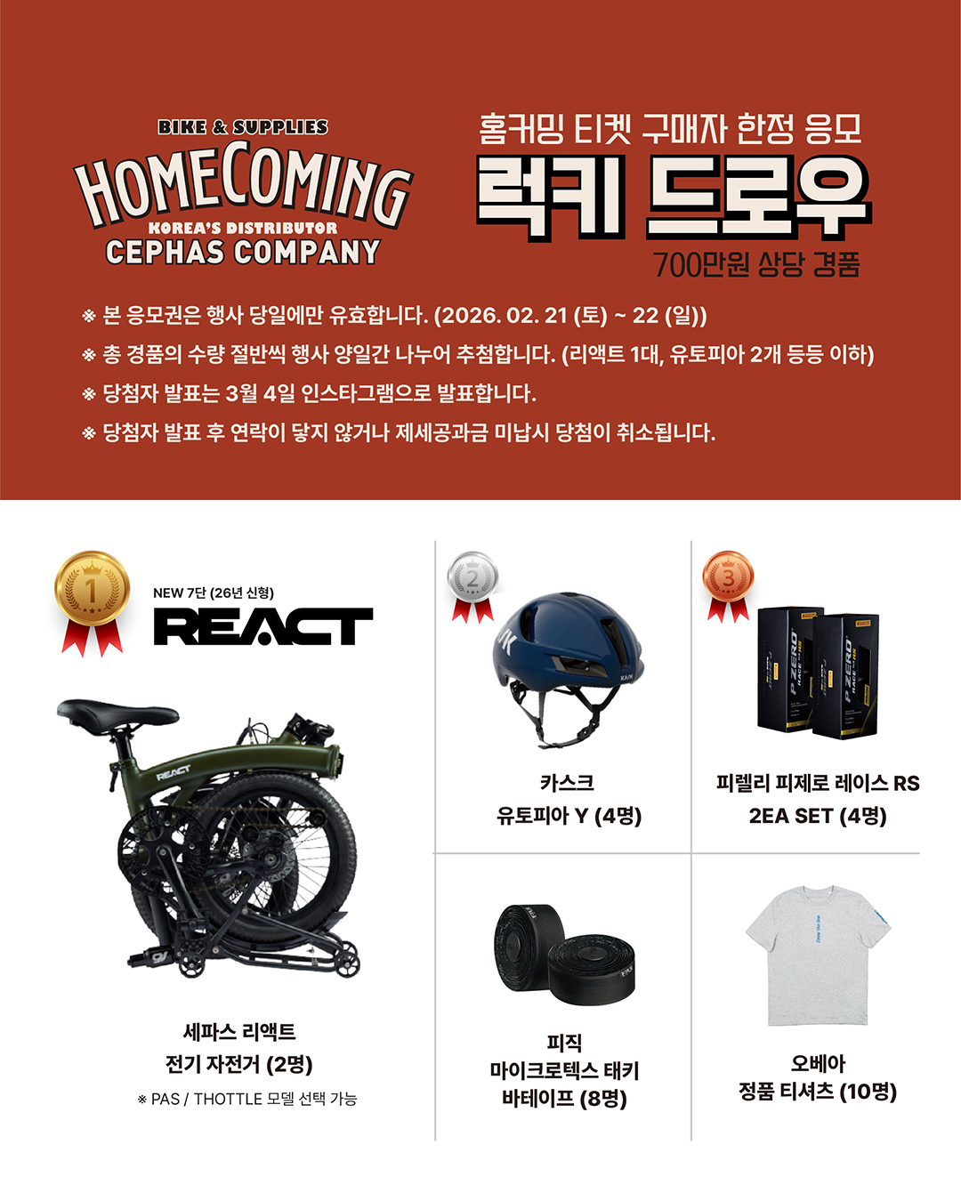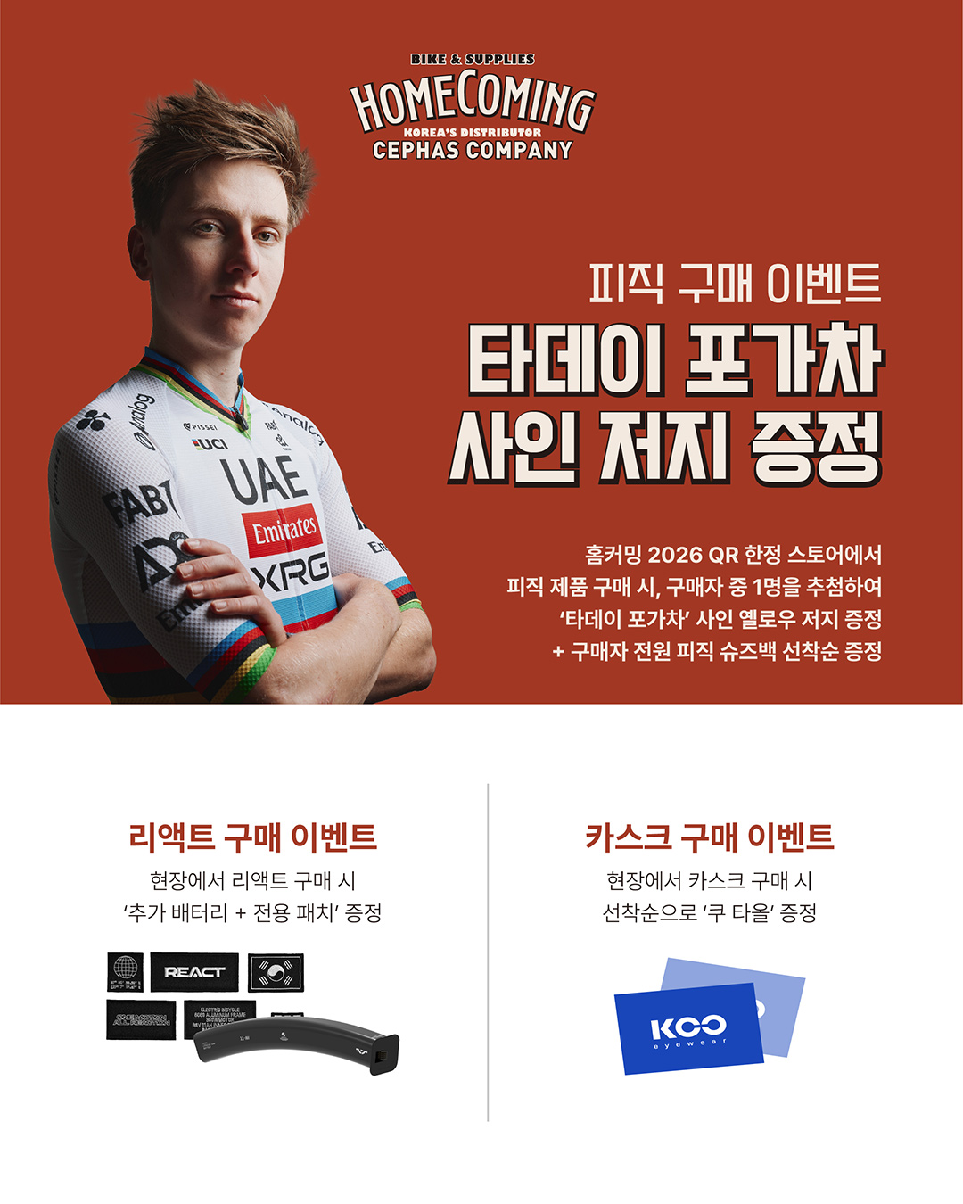피직 제품 구매 시 슈즈백을 증정하며, 추첨을 통해 '타데이 포가차(Tadej Pogacar) 친필 사인 옐로 저지'를 증정하는 특별한 기회가 주어진다. 이 외에도 카스크 제품 구매 시 쿠 타올을, 리액트 제품 구매 시 추가 배터리 및 라이드백 전용 패치를 증정하는 등 실질적인 혜택을 강화했다.