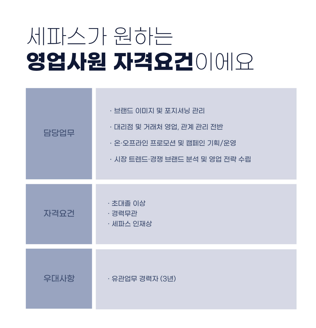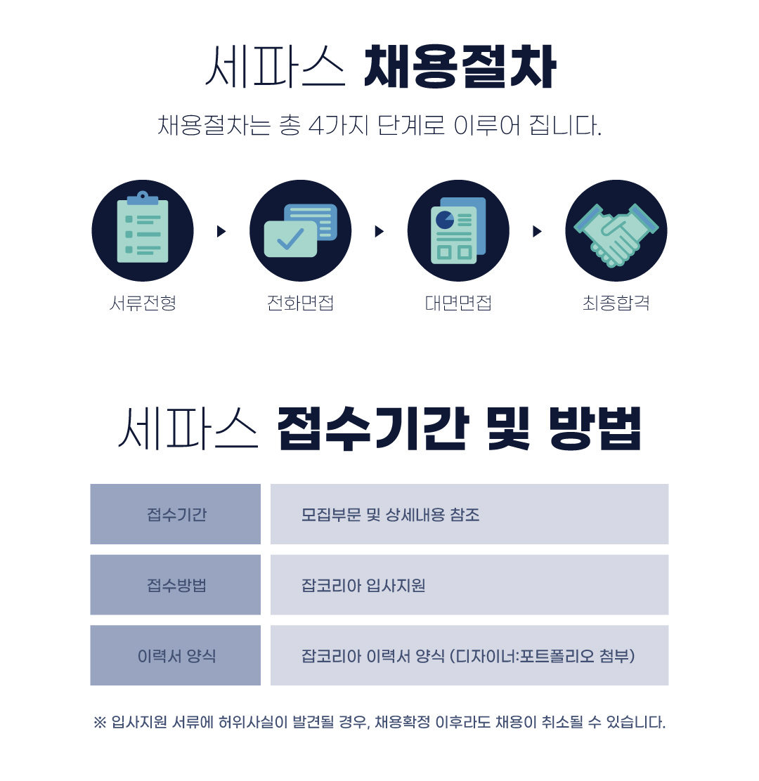 세파스, 영업사원 및 디자이너 채용 공고 2026년 02월 06일 에디터 : 바이크매거진 다양한 자전거 및 아웃도어 브랜드를 유통하는 세파스가 함께 할 영업사원 및 디자이너를 채용한다. 자세한 내용은 아래와 같으며, 채용 절차는 잡코리아 웹사이트를 통해 진행된다.[세파스 영업사원 채용 바로가기][세파스 디자이너 채용 바로가기]
