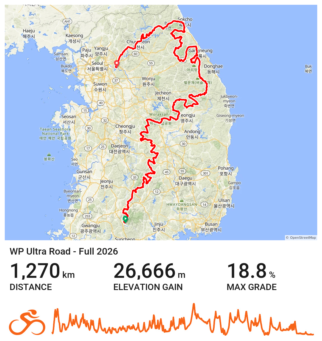 초장거리 울트라 사이클링 대회인 2026 백두대간 울트라로드의 참가 신청이 시작되었습니다. 이번 시즌은 차량으로 인한 위험도가 높아진 구간을 우회하고, 미시령 등의 새로운 업힐이 추가된 것이 특징입니다.