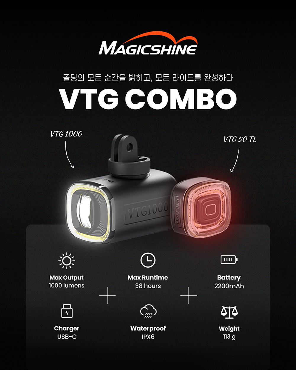 브롬톤(Brompton)과 협업으로 개발된 매직샤인(Magicshine) VTG 라이트가 우리나라에 공식 출시되었다. 전조등과 후미등 콤보로 설계된 이 제품은, 폴딩바이크(미니벨로)에 잘 어울리는 컴팩트한 사이즈와 성능을 가진 것이 특징이다.