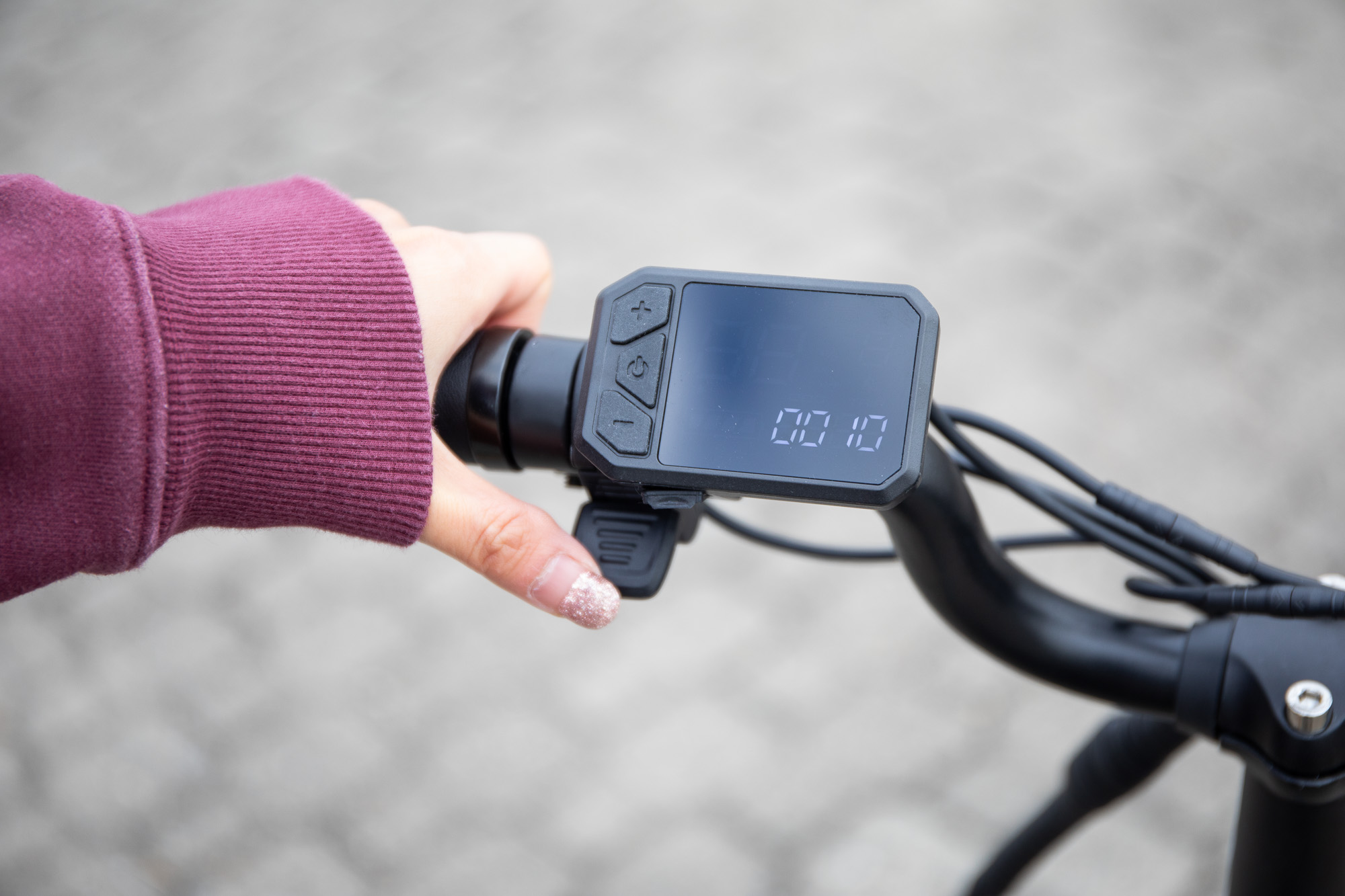 스로틀 레버를 아래로 밀면 페달링 없이도 20km 이상의 스피드가 어렵지 않다.