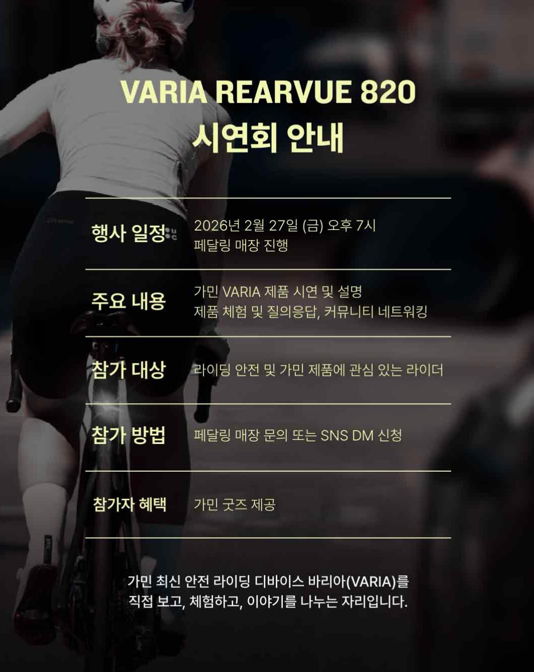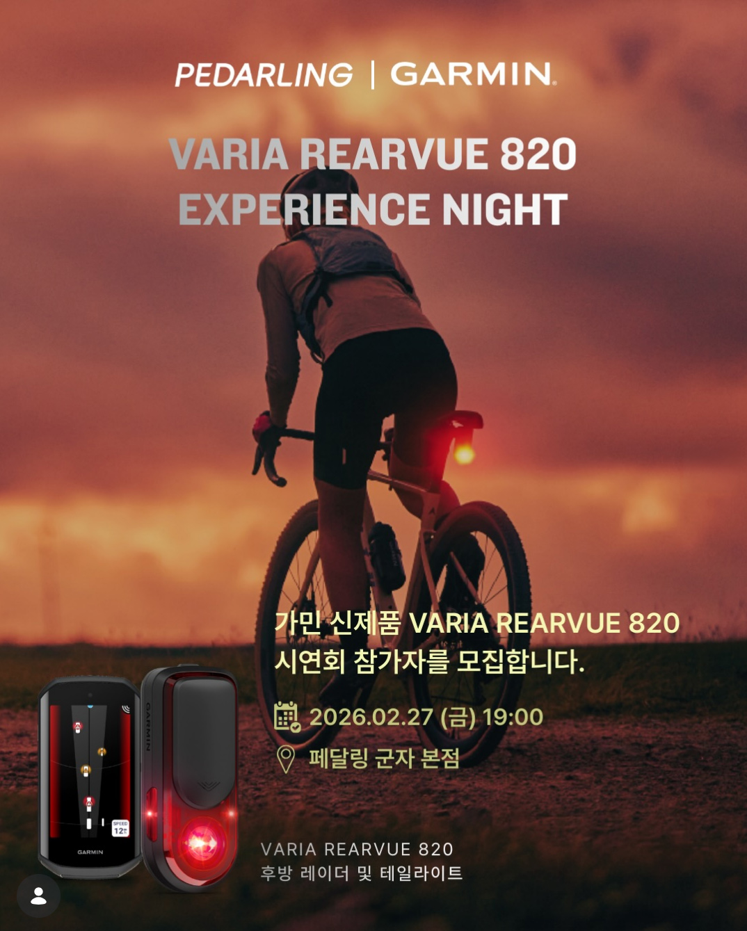 가민(GARMIN)은 최근 새롭게 발표한 후방 레이더 바리아 리어뷰 820(Varia RearVue 820)의 시연 및 설명회를 오는 2월 27일(금) 페달링 군자점에서 진행한다.
