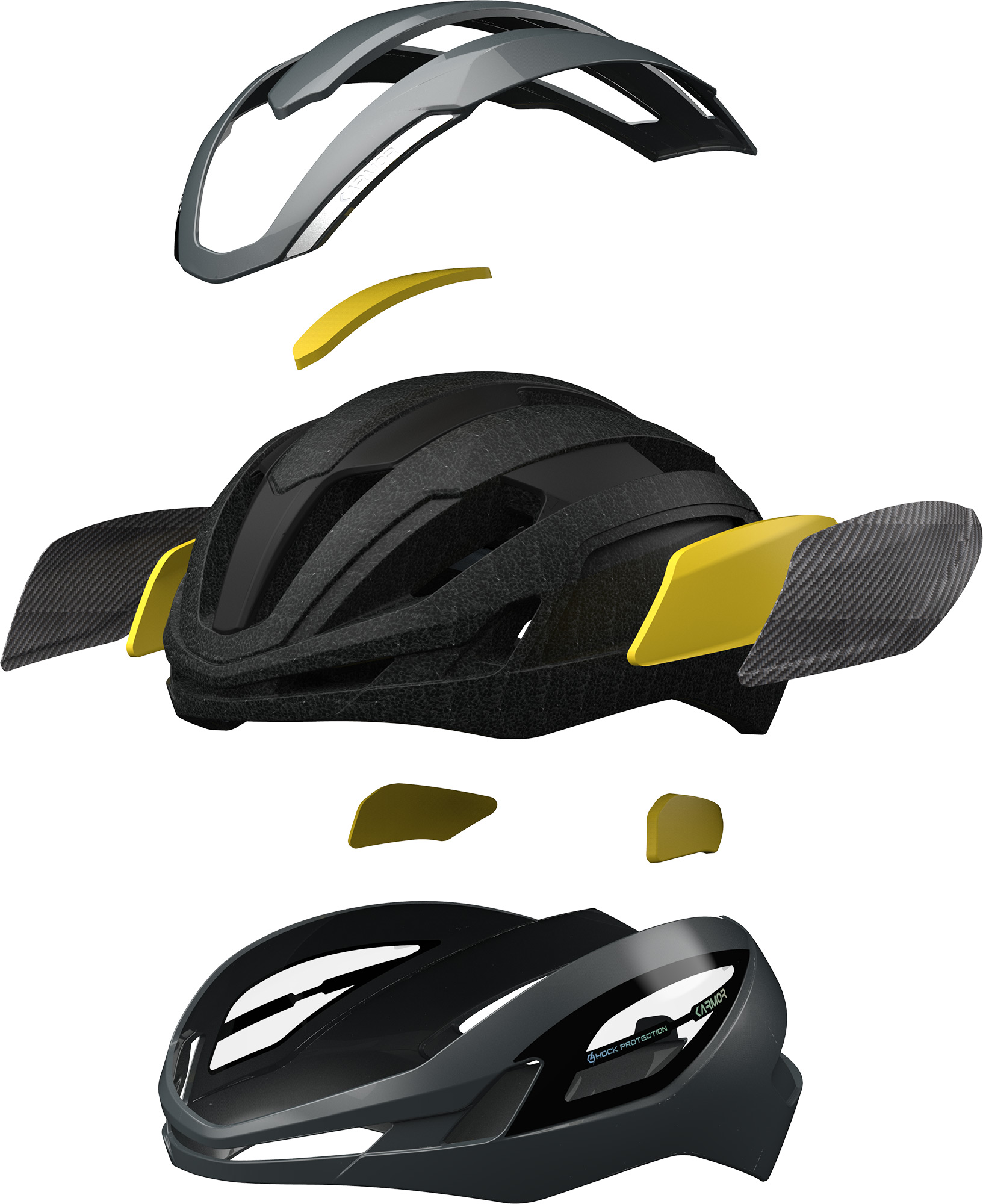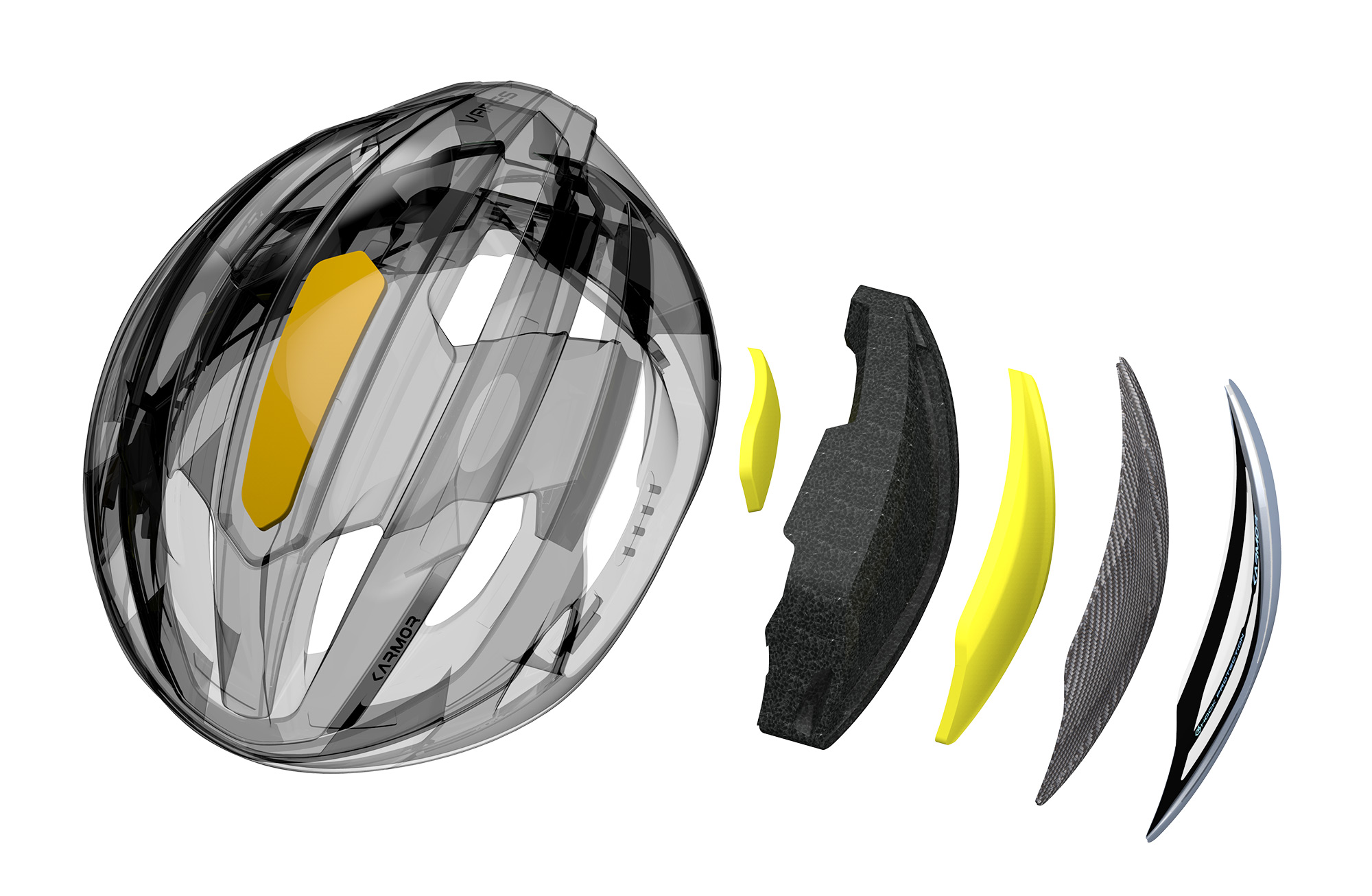 쇼크프로텍션 2.0은, 헬멧 상단과 측면에 고탄성 충격 흡수 소재인 PoronXrd 패드를 적용하여 외부 충격 에너지를 효과적으로 분산시키며, 측면부에는 3K 카본 구조를 내장하여 측면 강성을 높이고 충격 시 발생하는 구조적 변형을 최소화 한다.