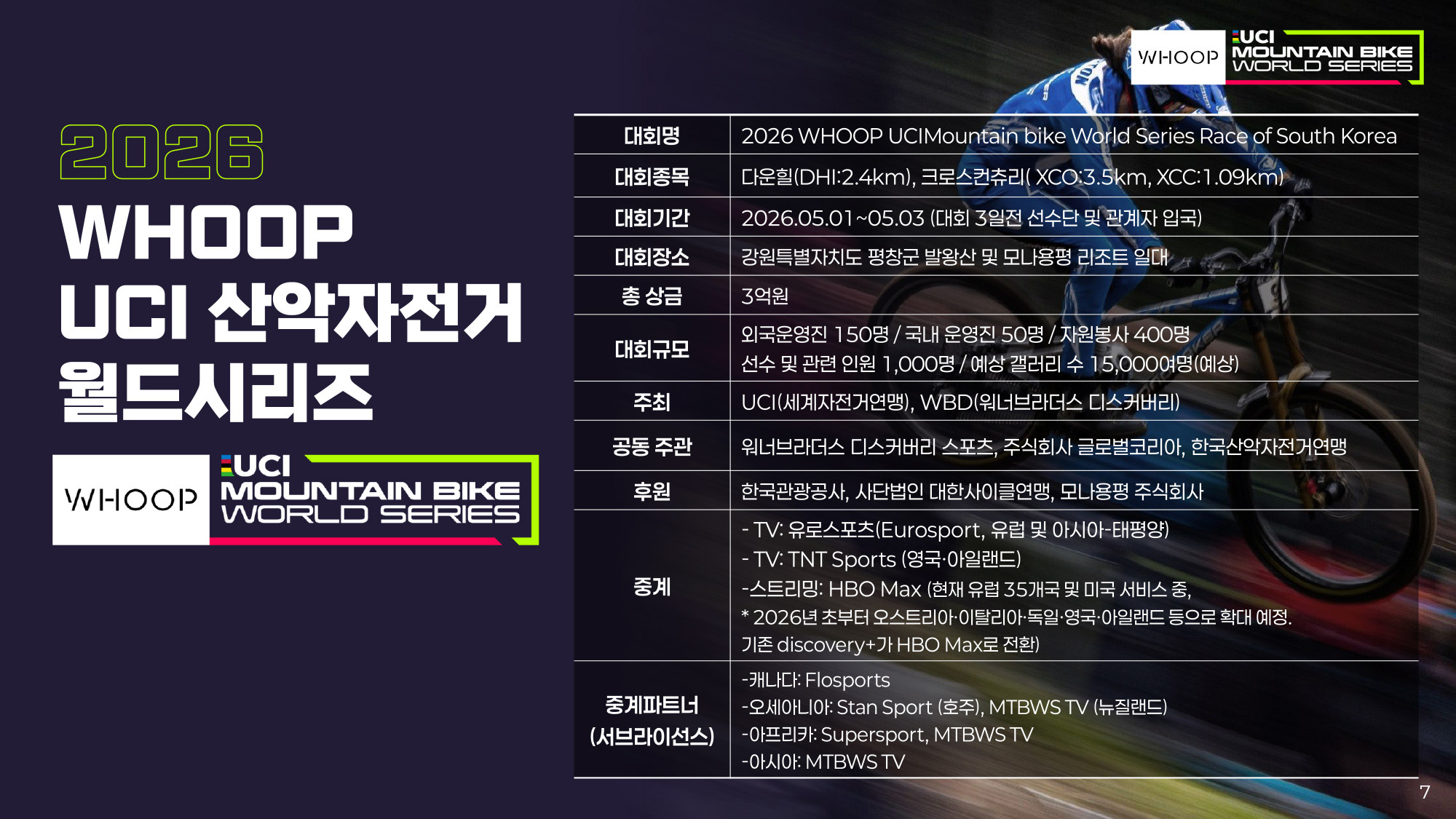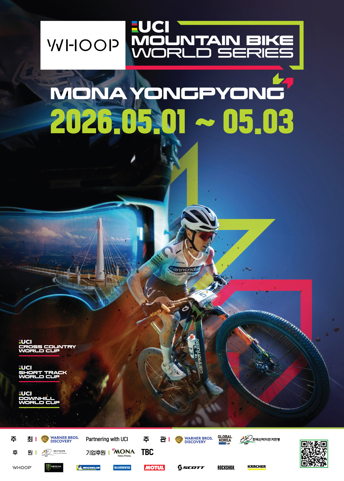 세계 최고 권위의 산악자전거(MTB) 대회인 ‘2026 WHOOP UCI 산악자전거 월드시리즈(UCI Mountain Bike World Series)’의 2026년 시즌 개막전이 대한민국 평창에서 개최된다. 아시아 지역에서 UCI 월드시리즈가 열리는 것은 이번이 처음으로, 한국은 2026년부터 2028년까지 3년 연속 개최를 확정 지으며 글로벌 스포츠 콘텐츠의 중심으로 도약할 전망이다.