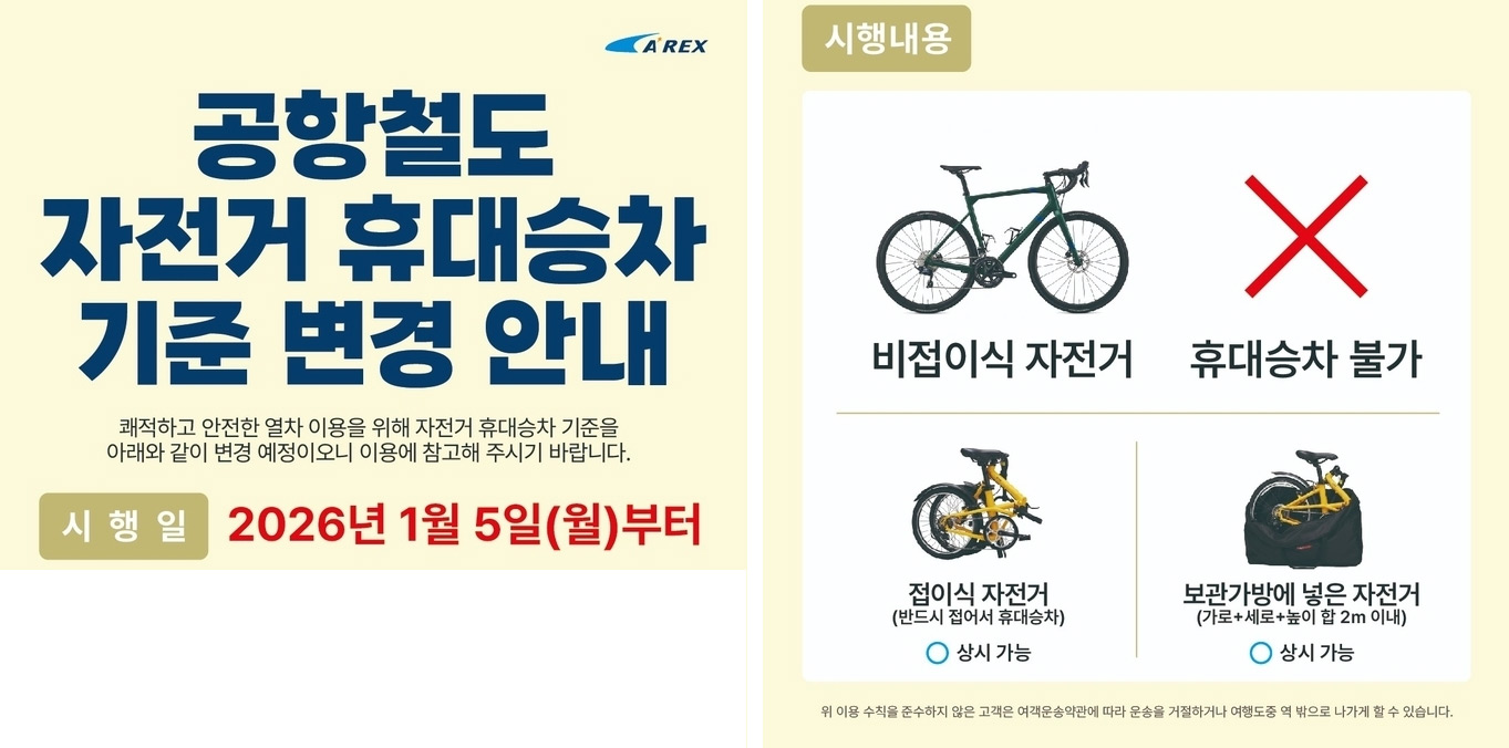 최근 공항철도가 일반 자전거의 휴대 승차를 전면 금지했다. 기존에 허용되던 주말과 공휴일마저 차단된 이번 조치는 자전거 이용자들에게 단순한 불편을 넘어, 국가 모빌리티 정책의 방향성에 대한 근본적인 의문을 던진다.