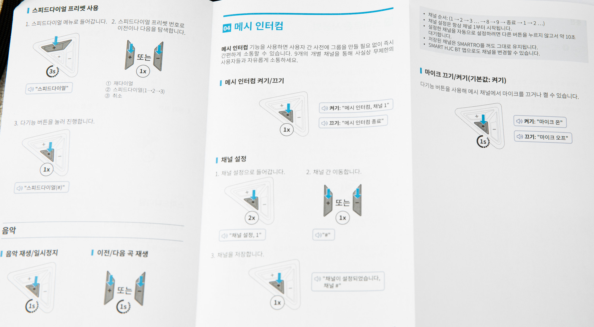 메시 인터콤은 가운데 버튼으로 ON/OFF 할 수 있고, 길게 눌러 마이크의 ON/OFF도 가능하다.