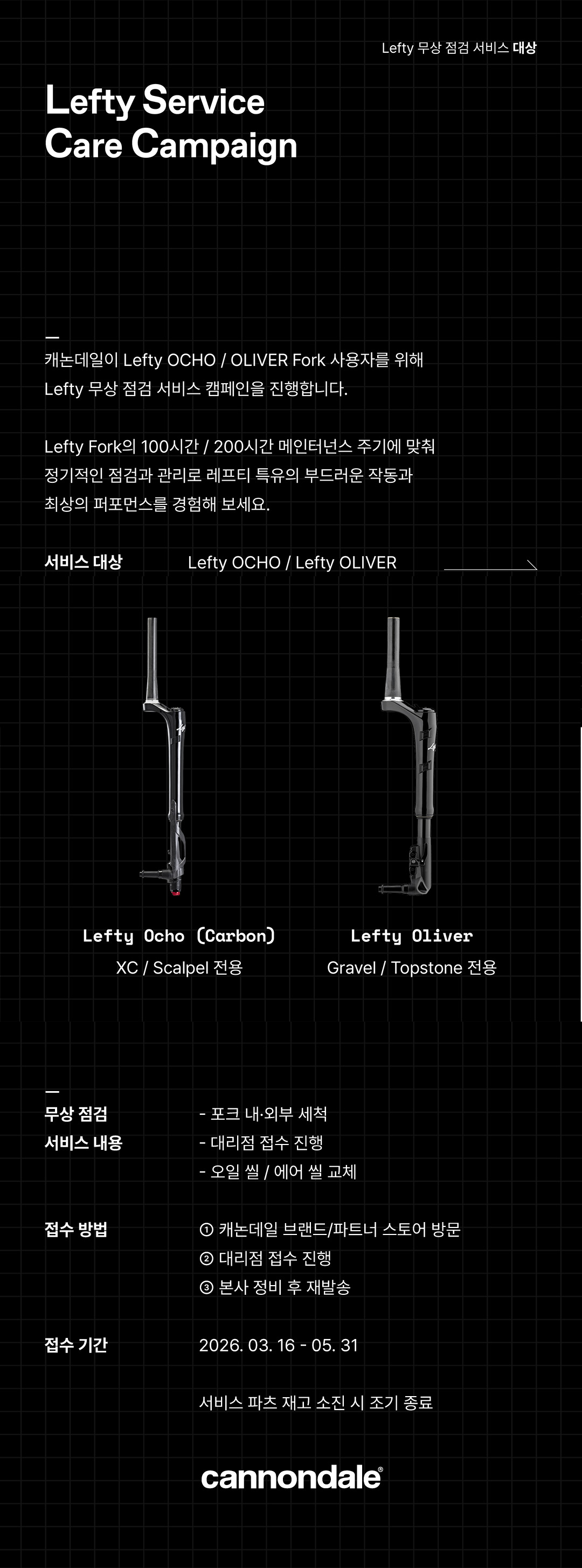 이번 캠페인은 레프티 오초(Lefty OCHO) 및 올리버(Lefty OLIVER) 포크 라인업 사용자를 대상으로 진행된다. 서스펜션 포크의 권장 메인터넌스 주기에 맞춰 라이더들의 정비 접근성을 높이고, 기계적 스트레스 누적에 따른 성능 저하를 방지하기 위해 마련된 무상 지원 프로그램이다.