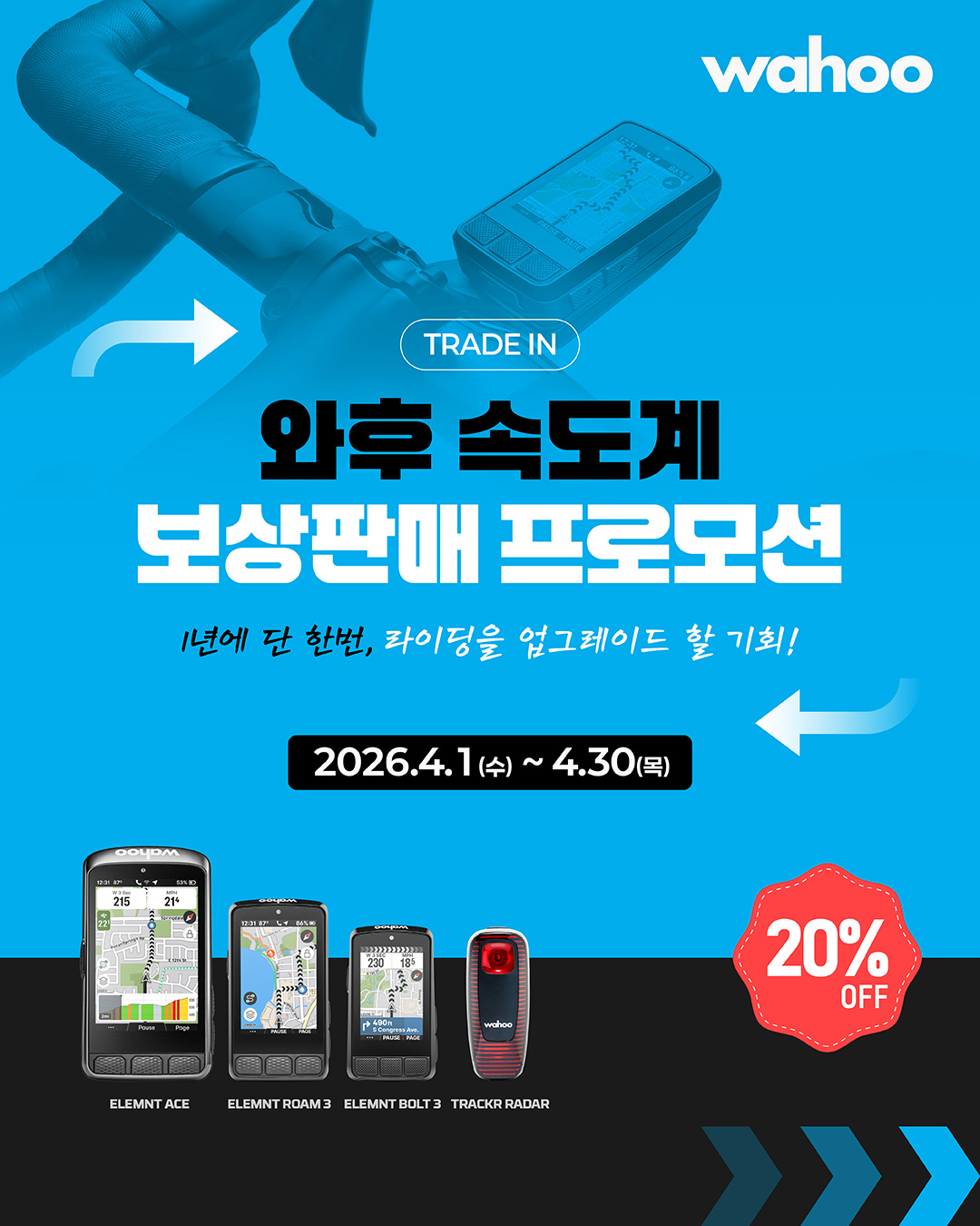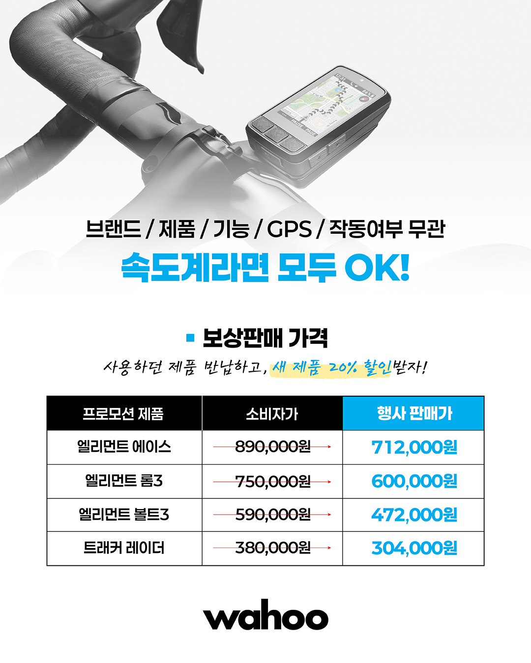 이번 프로모션은 기존에 보유하고 있던 사이클링 속도계를 반납할 경우, 와후의 신형 속도계 및 센서를 20% 할인된 가격에 구매할 수 있는 행사다.