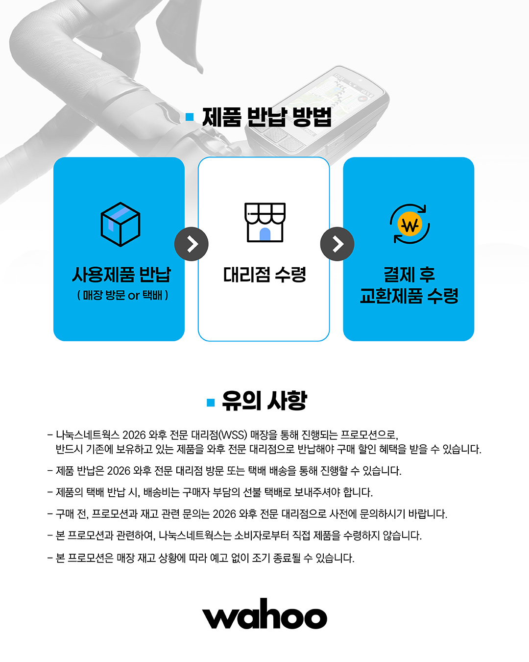 할인 혜택을 적용받기 위해서는 반드시 2026년 와후 전문 대리점(WSS)을 통해 기존 보유 제품을 반납해야 한다. 접수 및 제품 반납 절차와 유의사항은 다음과 같다.