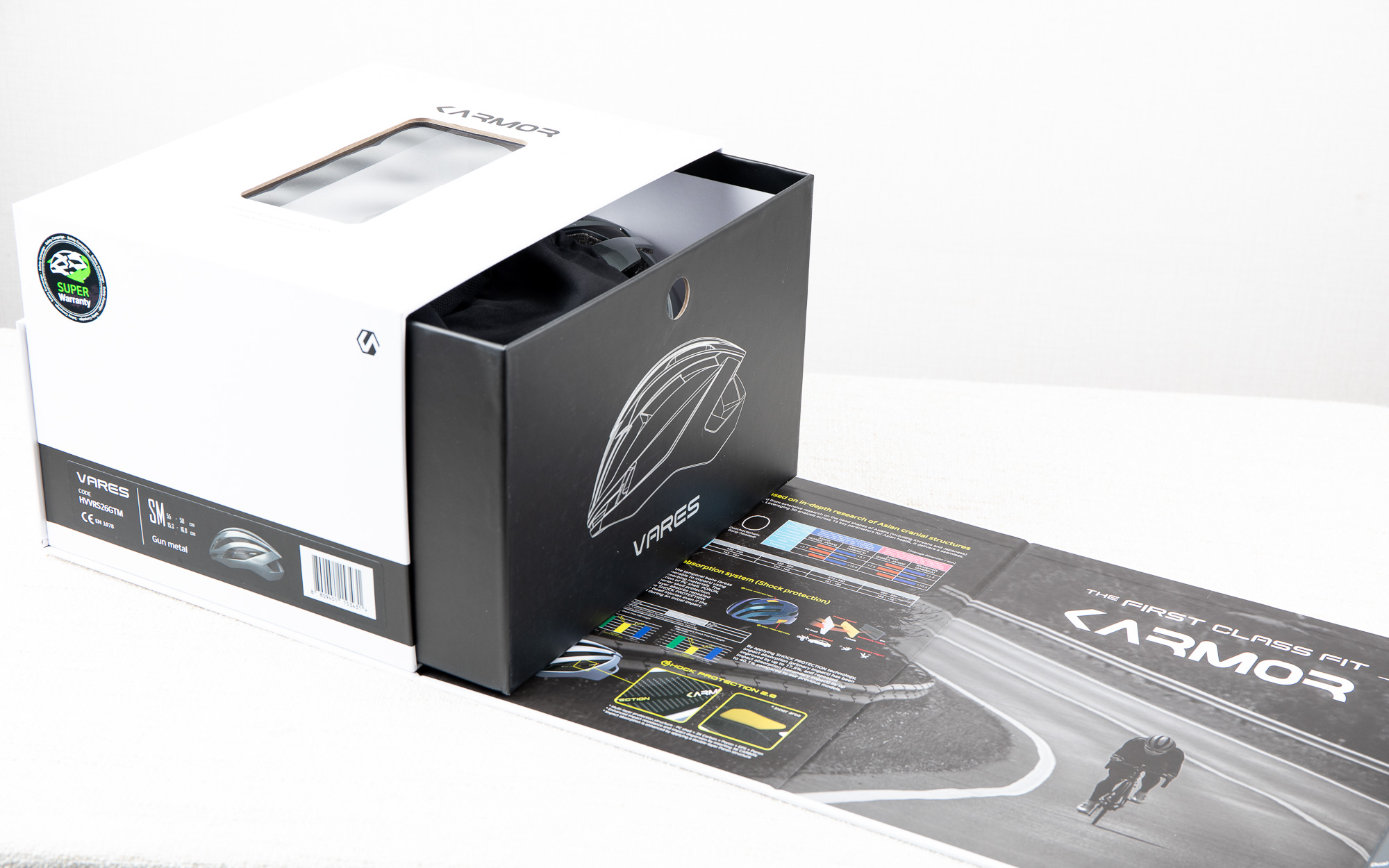 바레스 헬멧에 적용된 각종 기술들이 패키지에 인쇄되어 있다.