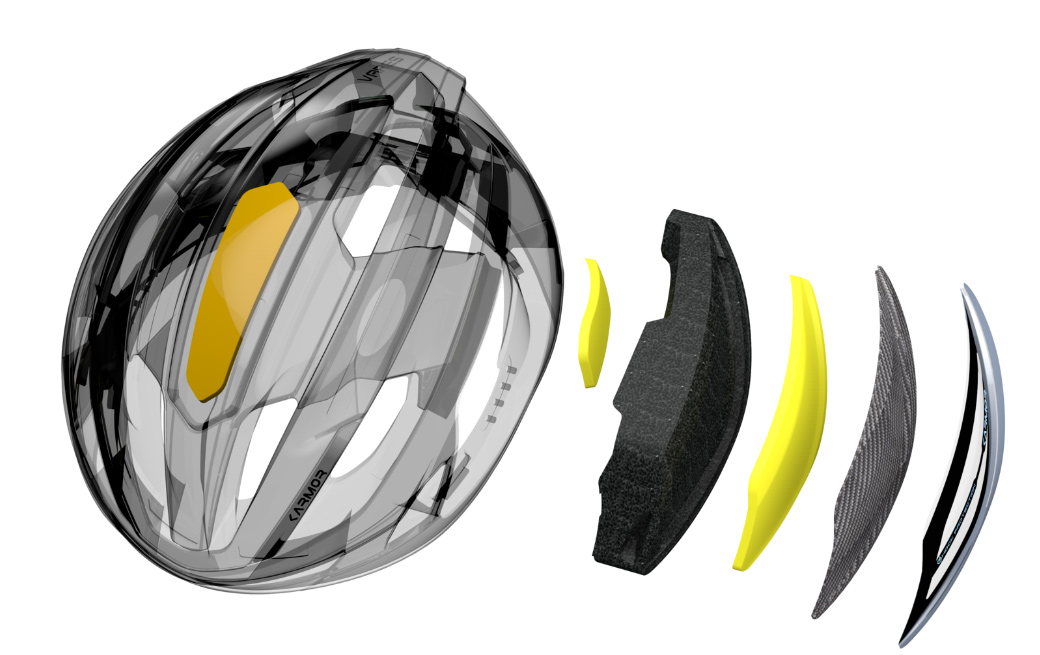 이것은 외부에 3K 카본 레이어를 더해 충격에 대비하고, 내부에는 머리에 직접 전달되는 충격을 흡수하기 위한 포론 패드를 장착했다. 그 결과 기존 헬멧보다 더 얇아 보이는 측면 EPS 폼을 유지하면서도, 바레스 헬멧은 자사의 이전 세대 최상위 모델인 '벨리언트(Veliant)' 헬멧과 비교하여 객관적인 충격 테스트 결과 상부 충격은 최대 12%, 측면 충격은 최대 25%까지 극적으로 감소시키는 놀라운 성능 향상을 입증하였다.