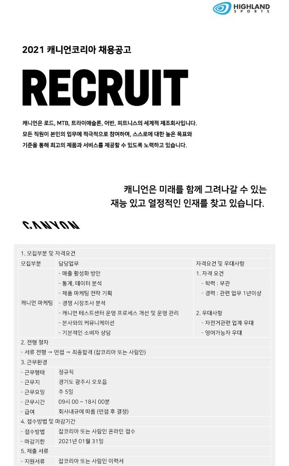 마케팅 해당 업무는 기획, 광고매체 기획 및 관리, 프로모션과 이벤트, 프로젝트 관리 등이며, 학력과 경력에 상관없이 채용한다. 캐니언 코리아는 통계분석 및 영어가능자, 유관업무 및 자전거 업계 3년 이상의 경력, 레저스포츠와 트렌드 등에 이해와 관심이 높은 인재를 우대한다고 밝혔다.