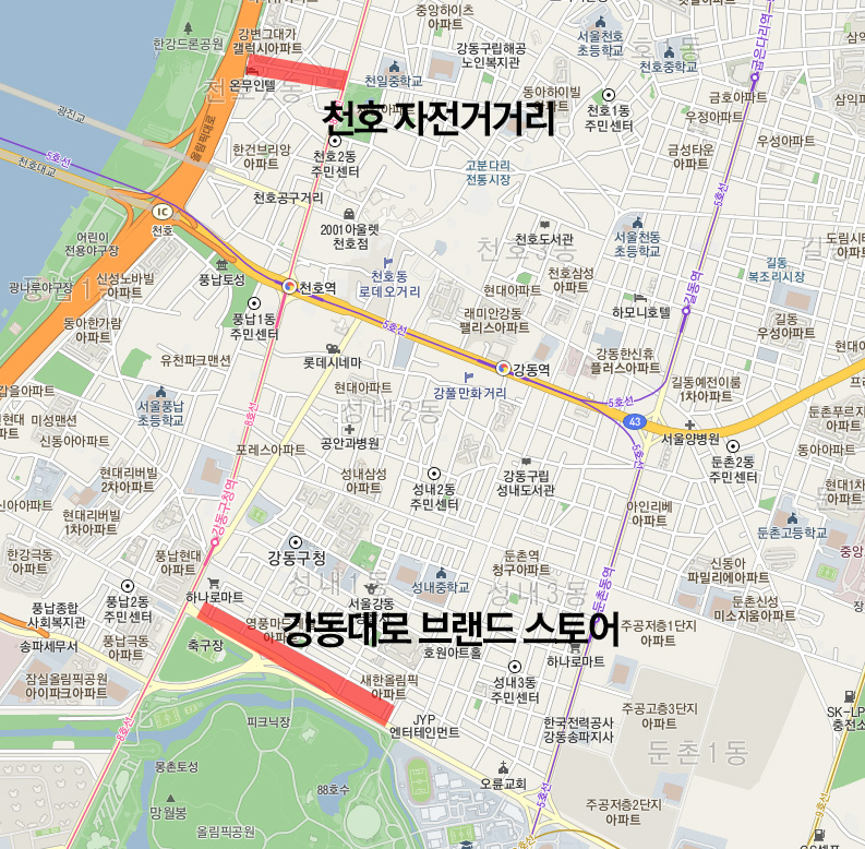 성내동의 강동대로, 천호동의 천중로 등에 우리나라에서 대표할 만한 자전거 브랜드 스토어와 회사들이 입점하여 강동구의 새로운 명소로 부각됨에 자부심을 느끼고 있습니다.