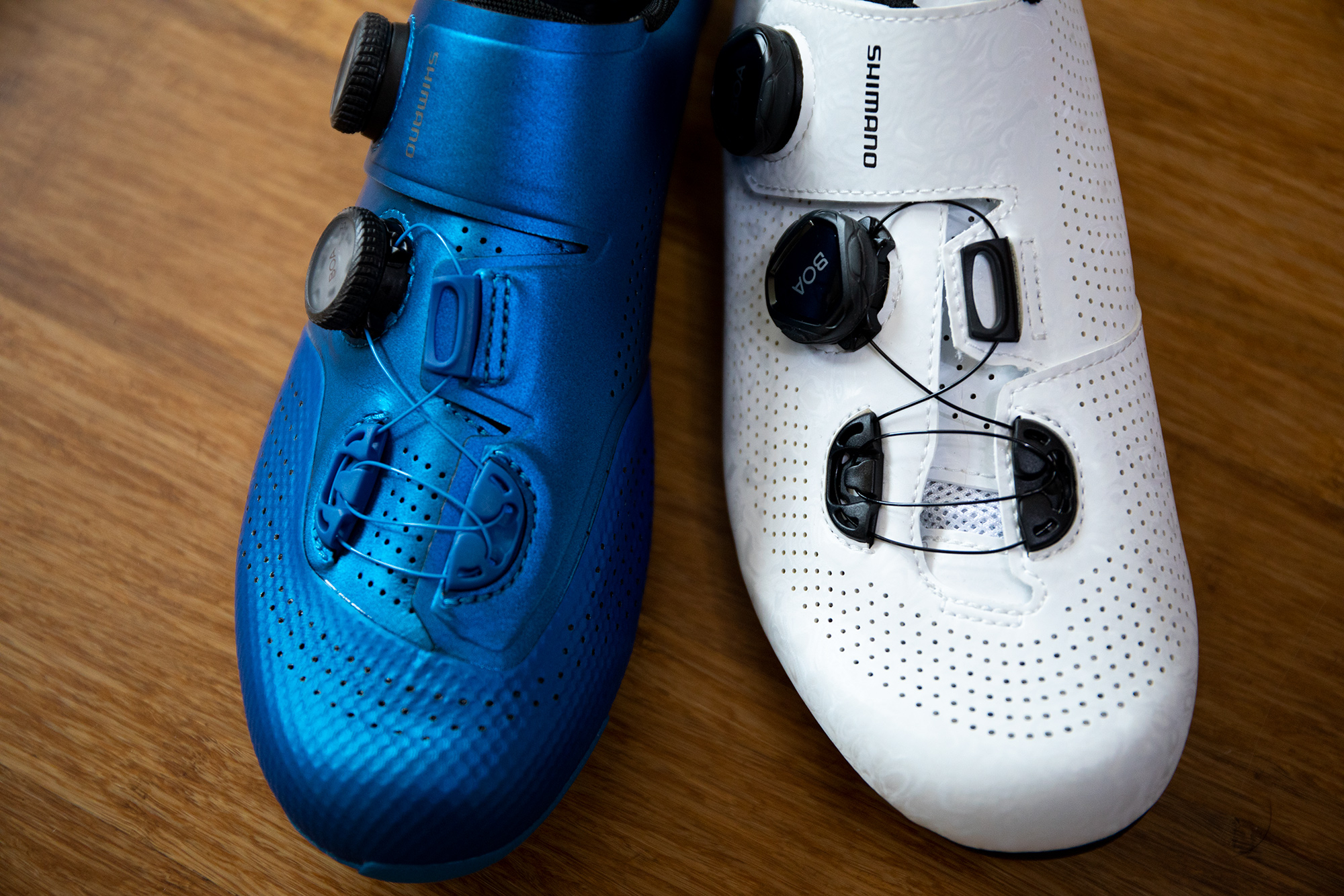동일한 클로저 시스템을 사용하지만, 레이스 퍼포먼스(파란색)는 엔듀런스 퍼포먼스 슈즈(흰색)에 비해 더 단단한 외피를 적용하는데, 더 단단한 외피는 힘전달력을 높이면서 낙차 시 발을 보호하고, 더 부드러운 외피는 발을 더 편하게 감싸서 장시간 라이딩에 유리하다.