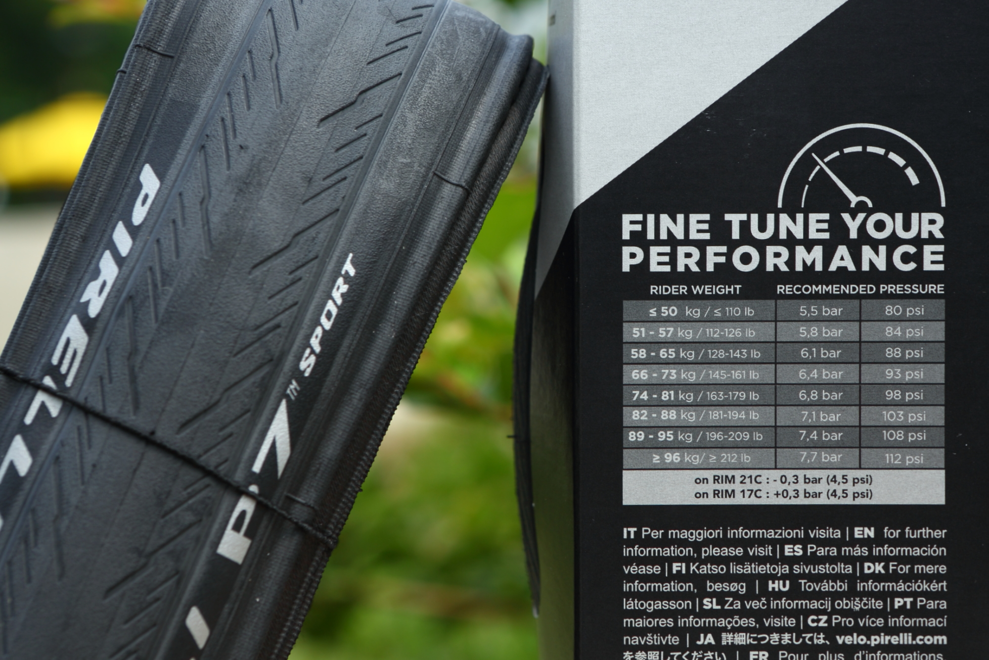 P7 스포츠 최소최대 공기압은 80-116psi이며, 권장 공기압표에서 이너 림 폭과 체중에 따라 선택한다.