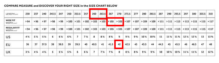 슈 사이징 가이드를 출력한 후 자신의 발의 사이즈를 측정, 표에서 자신의 발이 와이드인지 레귤러인지 확인할 수 있다.
