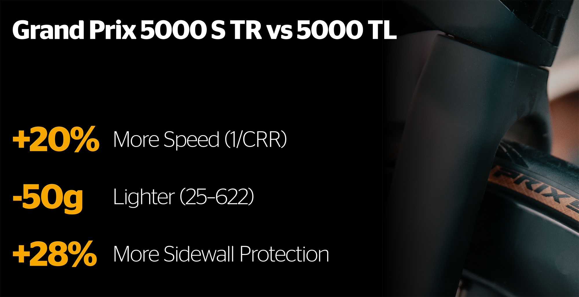 그랑프리 5000 S TR은 기존 튜블리스 타이어인 5000 TL보다 20% 더 빠르고, 50g 더 가벼운 무게를 가지면서, 사이드월 보호가 28% 더 강화되었다.