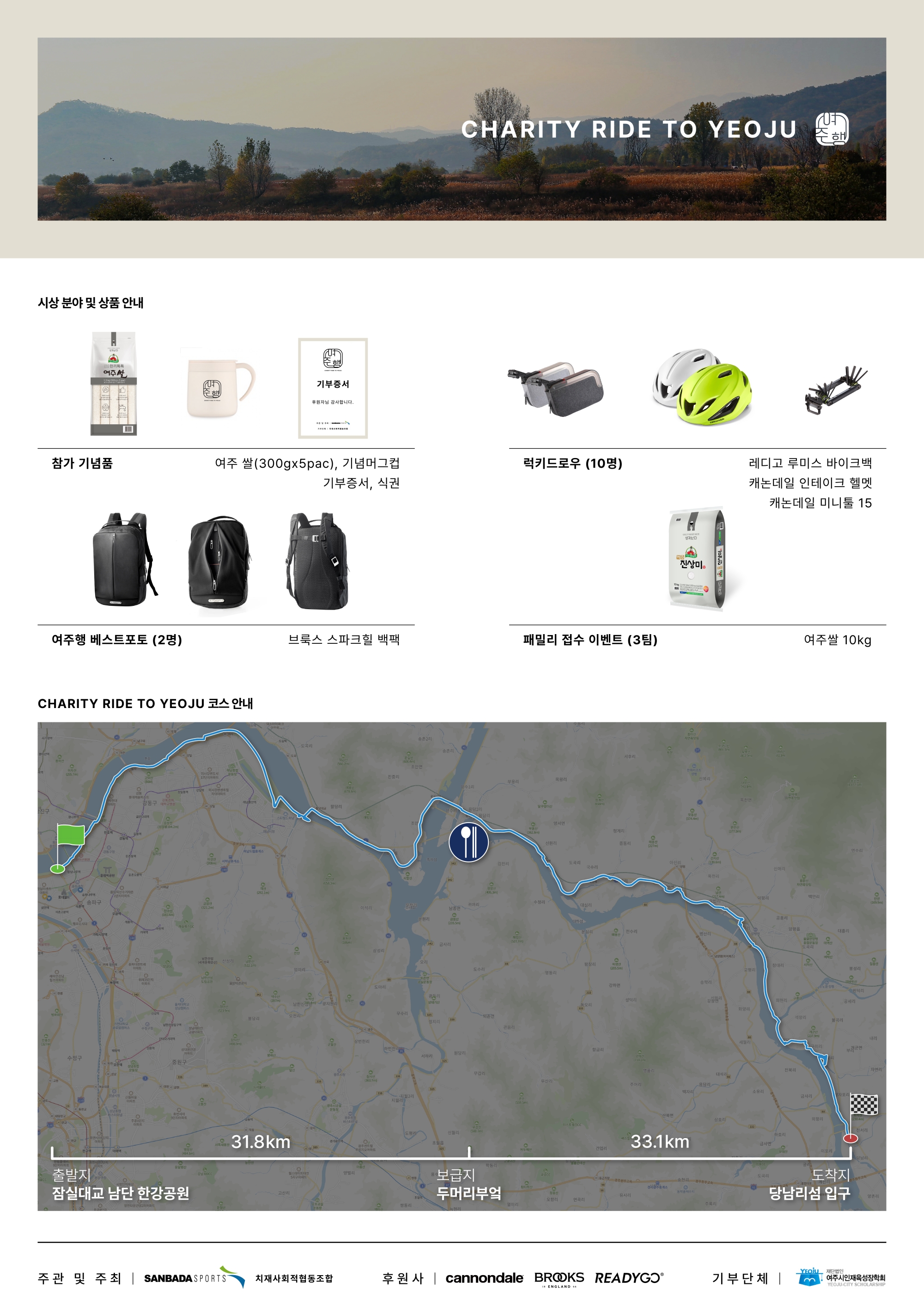 참가비는 성인 5만원, 미성년자 2만원이며, 참가비는 전액 여주시 인재육성장학회에 기부된다. 산바다스포츠는 참가자에게 점심 식권과 여주쌀, 기념 머그컵, 기부증서를 제공한다. 또 라이딩 중에 촬영한 사진을 인스타그램에 필수 해시태그와 함께 인증하면 2명을 선정해 브룩스 스파크힐 백팩을 증정하며, 럭키드로우로 캐논데일 인테이크 헬멧, 레디고 루미스 바이크백, 미니툴을 선물한다. 가족과 함께 접수한 팀 중 추첨을 통해 3팀에게 여주쌀 10kg도 제공된다.