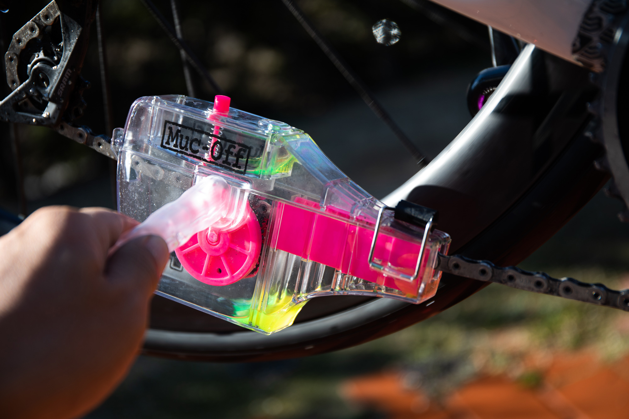 체인을 돌리면서 상단 핑크색 버튼을 누르면 드라이브트레인 클리너가 나오면서 체인을 자동으로 청소한다.