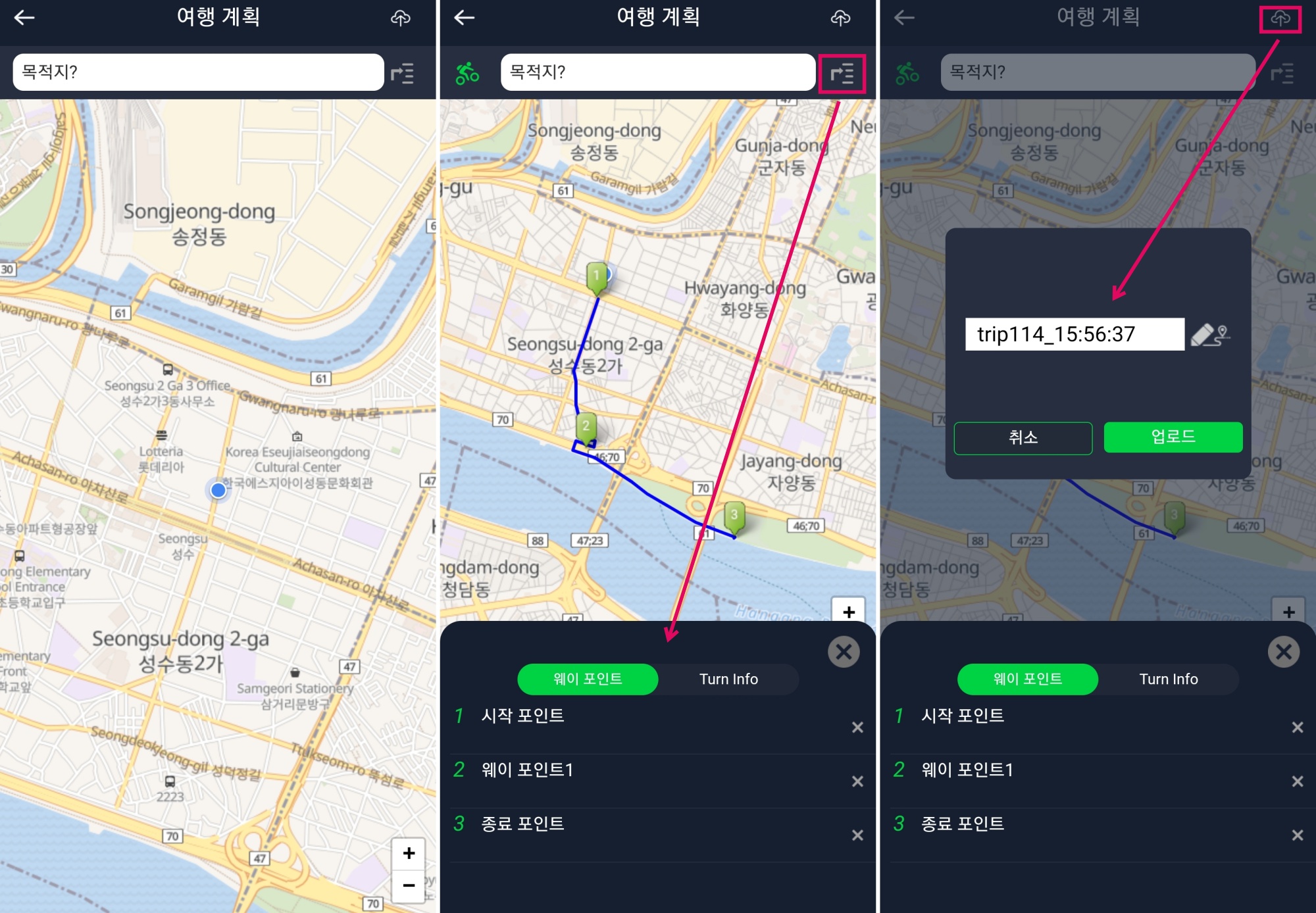 경로를 완성하면 오른쪽 상단의 클라우드 버튼을 누르면 '내 루트'에 업로드된다.