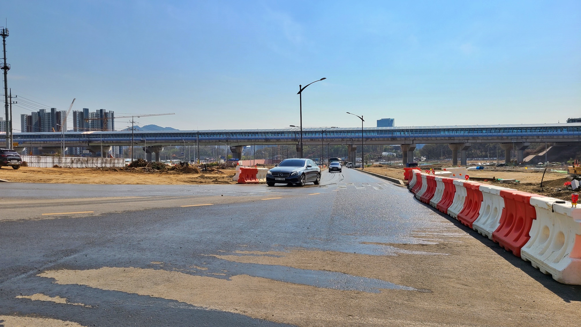 제2경인고속도로가 보이는 언덕 아래에 있는 사거리에서 우회전하면 동편마을로 우회할 수 있다. (파란색)