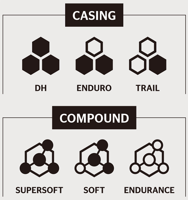 엔듀런스 컴파운드는 트레일 라이딩을 위해 높은 내구성으로 오래 사용할 수 있고, 소프트 컴파운드는 그립과 구름저항의 이상적인 균형을 맞추어 다운힐 위주의 엔듀로 라이더에게 적합하다.